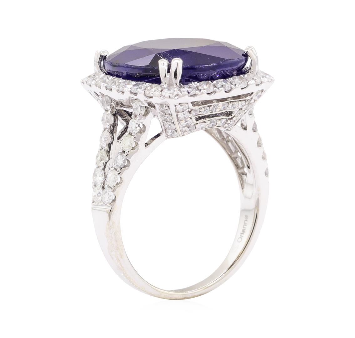 One electronically tested 14KT white gold lady's cast fashion ring with a split cathedral shank with a halo with a bright polish finish. The featured lady's ring has a shank measuring 1.85 millimeters wide. Trademark is Orianne. Condition is new, good workmanship. Containing: One prong set oval modified mixed cut natural blue sapphire, measuring 15.90 x 13.82 x 7.32mm, (depth est.) 5%. bulge factor, approximate weight of 14.04ct., clarity is severely included, dark, moderately strong, blue color, (GIA B 7/4), cut is good. Transmitting light diffusely, opaque to translucent. Colored gemstones are presumed to have been subjected to commonly used enhancement processes. Graded in the setting. Fifty prong set round brilliant cut diamonds, measuring 1.80 - 1.75 x 1.10mm (depth est.) approximate total weight of 50 Stones = 1.06ct. Graded in the setting. Color H - J Clarity SI-2 to I-1 Cut Good Fifty prong set round brilliant cut diamonds, measuring 1.40 - 1.30 x 0.81mm (depth est.) approximate total weight of 50 Stones = 0.45ct. Graded in the setting. Color H - I Clarity SI-2 to I-2 Cut Good. Total Weight of Colored Stones 14.04ct.. Total Weight of Diamonds 1.51ct.. Total Weight of Ring 7.60gm GAS Appraised at $13700.00. GAS Appraised at $13,700.00.