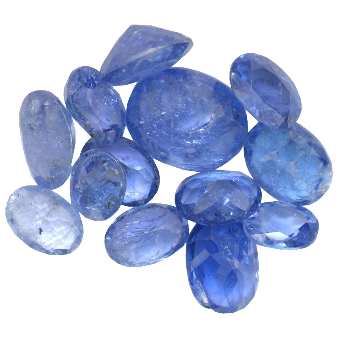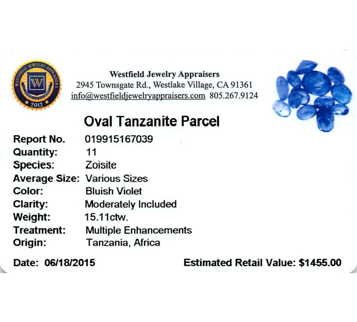 Eleven oval mixed cut natural tanzanites exact total weight 15.11ct., clarity is moderately included, type I, medium dark, very slightly grayish, bluish violet color, (GIA bV 6/3), cut is good. Transmitting light with a minimum of distortion, transparent. Naturally occurring internal & external characteristics are present. Color grade is an average for the group. Tanzanite is a very rare gemstone that is only found in the country of Tanzania. Originally discovered in 1967. Tiffany & Company, named the stone Tanzanite. It is found in the Usumburu Mountains that border the Umba Valley of northern Tanzania. Tanzanite occurs in gray, brown, violet, blue, reddish-purple, & green. The gem is interesting because of its exceptional pleochroism. Rotated in different directions a tanzanite will exhibit multiple changes of color. Tanzanite has a low tolerance to ultrasonic cleaning, and should not be cleaned using this method. Westfield Appraised at $1,455.00.
