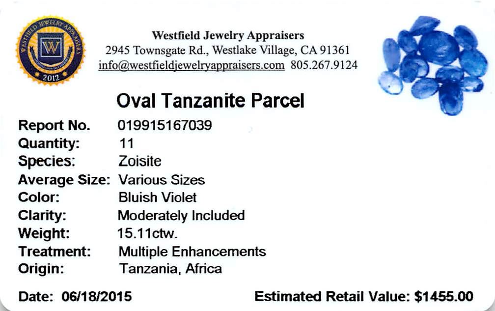 Eleven oval mixed cut natural tanzanites exact total weight 15.11ct., clarity is moderately included, type I, medium dark, very slightly grayish, bluish violet color, (GIA bV 6/3), cut is good. Transmitting light with a minimum of distortion, transparent. Naturally occurring internal & external characteristics are present. Color grade is an average for the group. Tanzanite is a very rare gemstone that is only found in the country of Tanzania. Originally discovered in 1967. Tiffany & Company, named the stone Tanzanite. It is found in the Usumburu Mountains that border the Umba Valley of northern Tanzania. Tanzanite occurs in gray, brown, violet, blue, reddish-purple, & green. The gem is interesting because of its exceptional pleochroism. Rotated in different directions a tanzanite will exhibit multiple changes of color. Tanzanite has a low tolerance to ultrasonic cleaning, and should not be cleaned using this method. Westfield Appraised at $1,455.00.