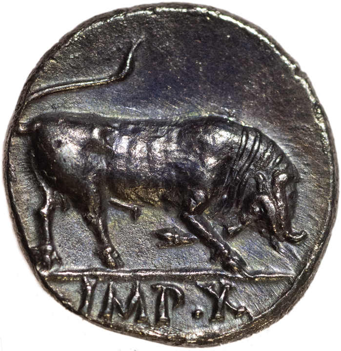 RIC-167a. 3.79 gms. Obv: Bare head of Augustus. Rev: Bull butting right. A very clean brilliant fabulously lustrous silver coin with the eye appeal of BU.