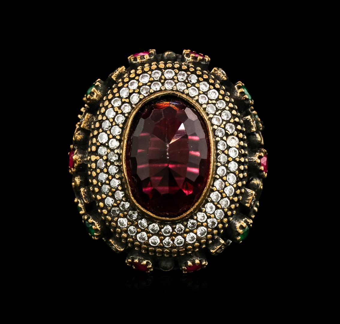 One 15.16ct Red Crystal and Multi Gemstone Ring - 925 SILVER. The featured lab created red crystal is set within tiered lab created cubic zirconia bezels supported by tapering lab created ruby, lab created emerald and lab created cubic zirconia set shoulders, completed by a four and one-half millimeter wide band. Bright and anodized finish. Identified with markings of "925". Condition is new, good workmanship. Containing: One bezel set oval mixed cut laboratory created red crystal, measuring 17.00 x 12.00 x 6.10mm, approximate weight of 15.16ct., clarity is eye clean, medium dark, very slightly brownish, slightly purplish red color, (GIA slpR 6/3), cut is good. Two bezel set oval mixed cut laboratory created rubies, measuring 5.00 x 3.00 x 1.95mm, approximate total weight of 0.50ct., clarity is eye clean, type II, dark, very slightly brownish, slightly purplish red color, (GIA slpR 7/3), cut is good. Four bezel set round mixed cut laboratory created rubies, measuring 3.10 - 3.00 x 1.98 mm, approximate total weight of 0.60ct., clarity is eye clean, type II, medium dark, very slightly brownish, slightly purplish red color, (GIA slpR 6/3), cut is good. Eight bezel set round mixed cut laboratory created emeralds, measuring 3.10 - 3.00 x 1.98 mm, approximate total weight of 0.80ct., clarity is eye clean, type III, medium dark, very slightly grayish, very slightly bluish green color, (GIA vslbG 6/3), cut is good. One hundred twenty-eight bead set round brilliant cut laboratory created cubic zirconias, measuring 1.70 - 1.50 x 1.04 mm, approximate total weight of 3.84ct., clarity is eye clean, colorless, very slightly grayish, white color, (GIA W 0/3), cut is good. Total Weight of Colored Stones 20.90ct. Total Weight of Ring 25.71gm. AIG Appraised at $2,100.00.
