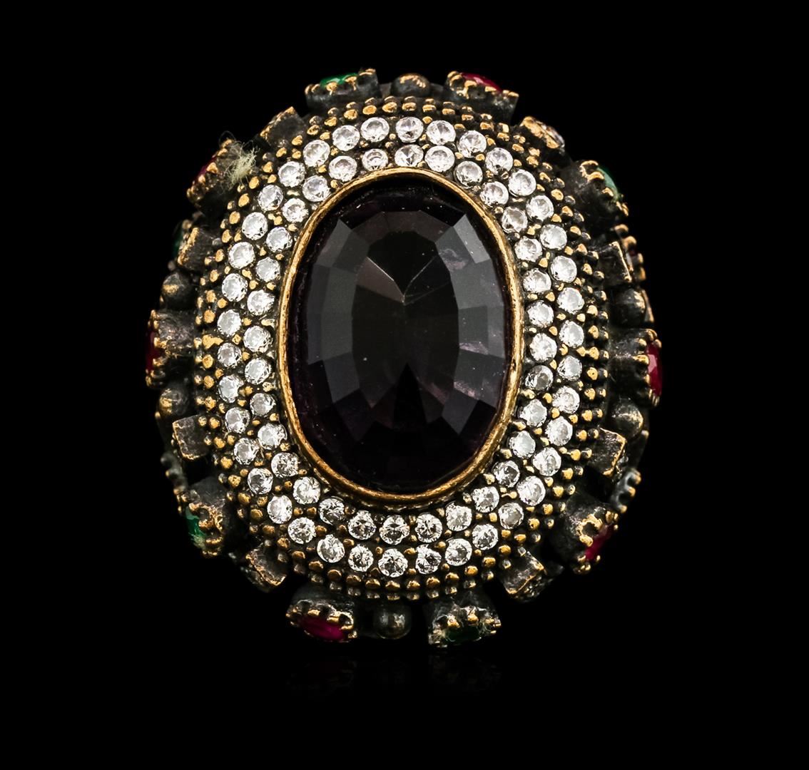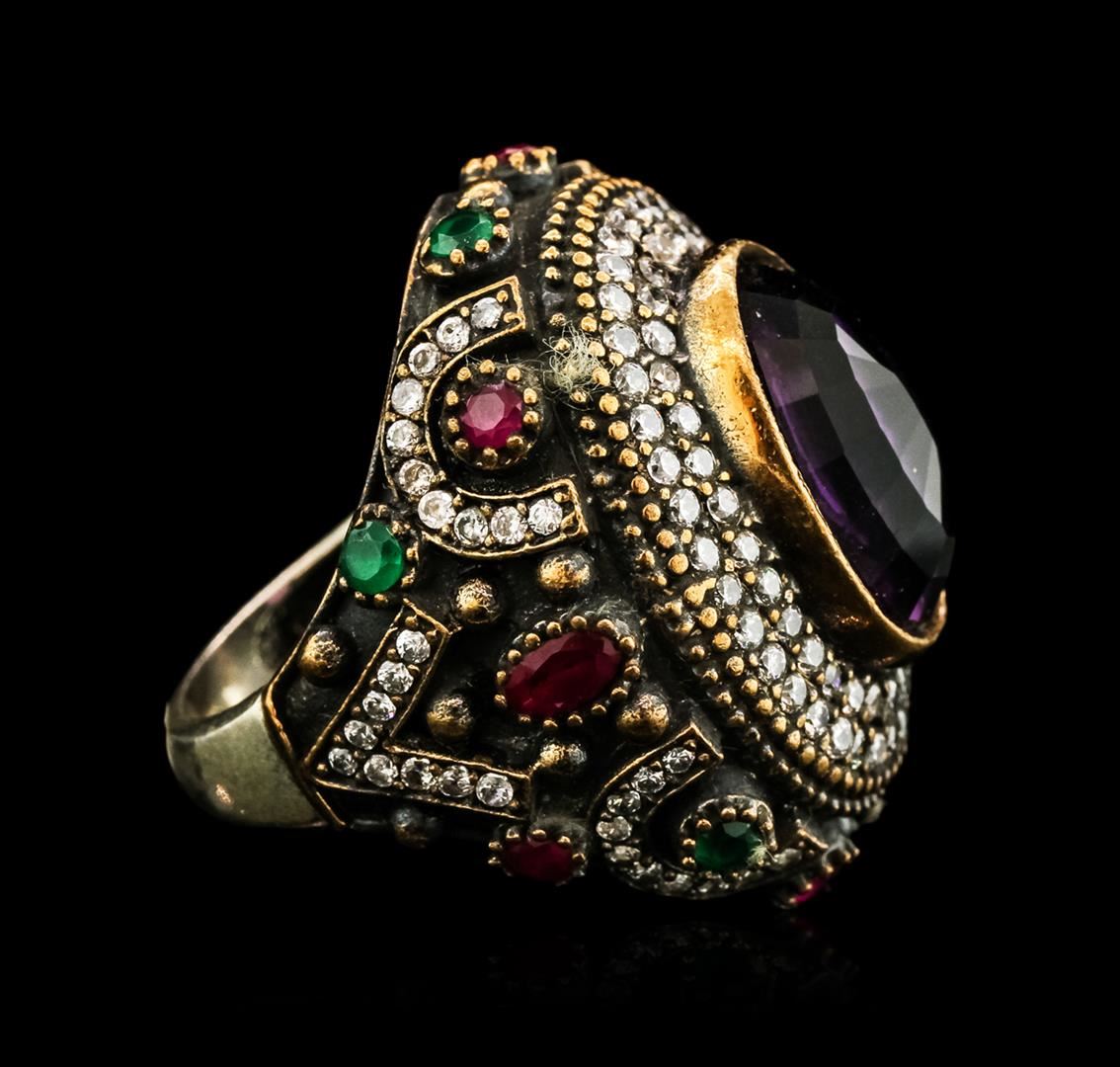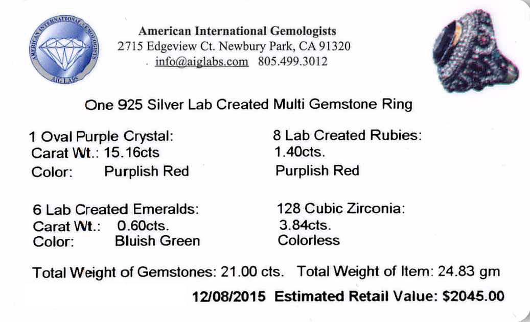 One 15.16ct Purple Crystal and Multi Gemstone Ring - 925 SILVER. The featured lab created purple crystal is set within tiered lab created cubic zirconia bezels supported by tapering lab created ruby, lab created emerald and lab created cubic zirconia set shoulders, completed by a four millimeter wide band. Bright and anodized finish. Identified with markings of "925". Condition is new, good workmanship. Containing: One bezel set oval mixed cut laboratory created purple crystal, measuring 17.00 x 12.00 x 6.10mm, approximate weight of 15.16ct., clarity is eye clean, medium dark, very slightly grayish, purple color, (GIA P 6/3), cut is good. Two bezel set oval mixed cut laboratory created rubies, measuring 5.00 x 3.00 x 1.95mm, approximate total weight of 0.50ct., clarity is eye clean, type II, medium dark, very slightly brownish, slightly purplish red color, (GIA slpR 6/3), cut is good. Six bezel set round mixed cut laboratory created rubies, measuring 3.10 - 3.00 x 1.98 mm, approximate total weight of 0.90ct., clarity is eye clean, type II, medium dark, very slightly brownish, slightly purplish red color, (GIA slpR 6/3), cut is good. Six bezel set round mixed cut laboratory created emeralds, measuring 3.10 - 3.00 x 1.98 mm, approximate total weight of 0.60ct., clarity is eye clean, type III, medium dark, very slightly grayish, very slightly bluish green color, (GIA vslbG 6/3), cut is good. One hundred twenty-eight bead set round brilliant cut laboratory created cubic zirconias, measuring 1.70 - 1.50 x 1.04 mm, approximate total weight of 3.84ct., clarity is eye clean, colorless, very slightly grayish, white color, (GIA W 0/3), cut is good. Total Weight of Colored Stones 21.00ct. Total Weight of Ring 24.83gm. AIG Appraised at $2,045.00.