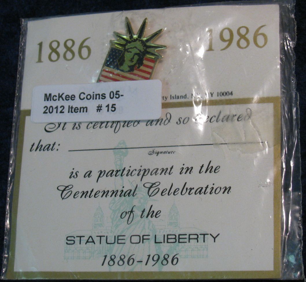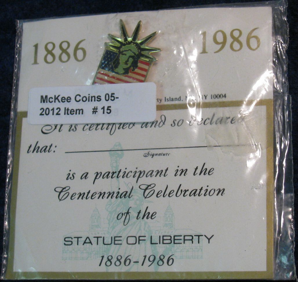 15. 1886-1986 Pinback and Badge for the Centennial Celebration of the Statue of Liberty.