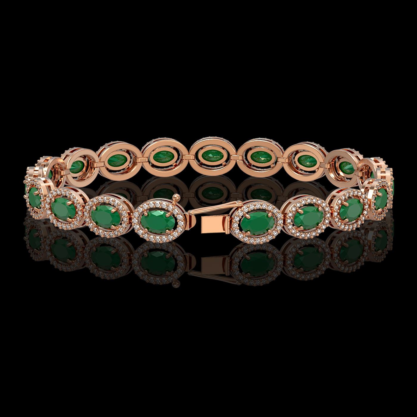 REF-255Y3K -40452 ---- 15.2 CTW Emerald & Diamond Halo Bracelet 10K Rose Gold ---- Luxury Designer Brand Bracelet Appraised at $14,050 Certificate Number US40452 10k Rose gold, Bracelet Size is 7 Inches, Bracelet measuring approx. 8 mm x 7 Inches, weighing in total approx. 13 grams. Made in the USA and is stamped 10k, Main stone 12.35 carat total weight containing 19 pieces of Intense Medium Green color with AAA quality Oval shape cut Emerald , Stone #2 2.85 carat total weight containing 380 pieces of G-H color with VS/SI quality Round shape cut Diamond