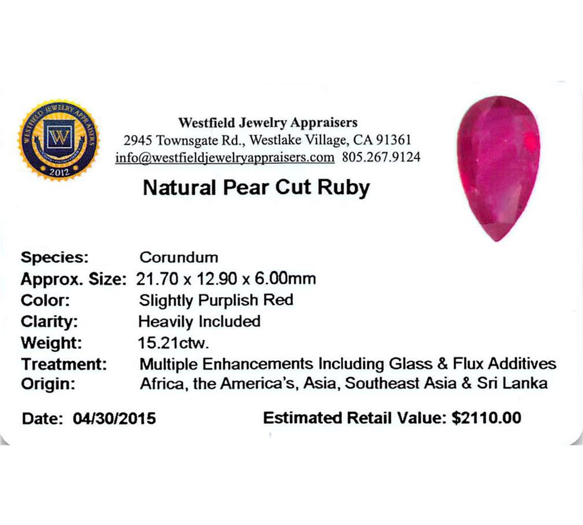 One pear cut natural ruby, measuring 21.70 x 12.90 x 6.00mm, exact weight 15.21ct., clarity is heavily included, type II, medium dark, moderately strong, slightly purplish red color, (GIA slpR 6/4), cut is good. Transmitting light somewhat diffusely, transparent to translucent, Indications of laboratory high temperature heat treatment, with glass & flux additives. Low tolerance to rhodium plating, repolishing the surface & ultrasonic cleaning. Westfield Appraised at $2,110.00.