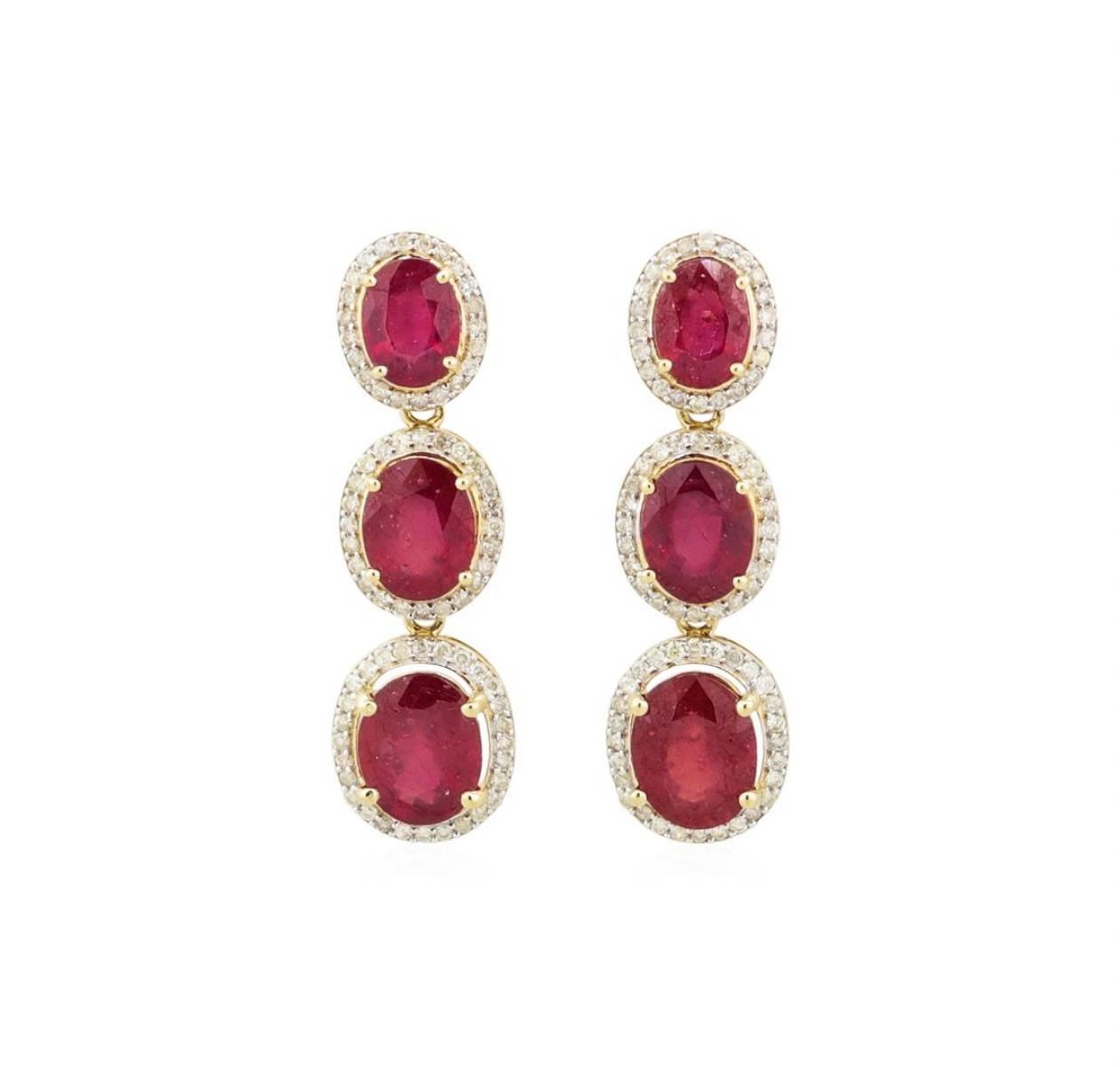 One pair electronically tested 14KT yellow gold ladies cast & assembled ruby and diamond dangle earrings with screw backs. Each earring features a series of graduating ruby and diamond bezels. Bright polish finish with rhodium accents. Trademark is Orianne. Identified with markings of "14K". Condition is new, good workmanship.Containing: Six prong set oval mixed cut natural rubies approximate total weight of 15.25ct., clarity is heavily included, type II, medium dark, very slightly brownish, slightly purplish red color, (GIA slpR 6/3), cut is good. Transmitting light somewhat diffusely, transparentto translucent. Naturally occurring internal & external characteristics are present. Indicationsof laboratory high temperature heat treatment, with glass & flux additives. Color grade is anaverage for the group. Graded in the setting. Ruby has a low tolerance to rhodium plating,repolishing the surface, & ultrasonic cleaning. One Hundred Forty-Eight prong set round brilliant cut diamonds approximate total weight of 148 Stones = 1.06ct. Graded in the setting. Clarity I-1 to I-2 Color G - I Total Weight of Colored Stones 15.25 ct. Total Weight of Diamonds 1.06 ct. Total Weight of Earrings 9.28 gm Estimated Retail Value $ 6,845.00 US