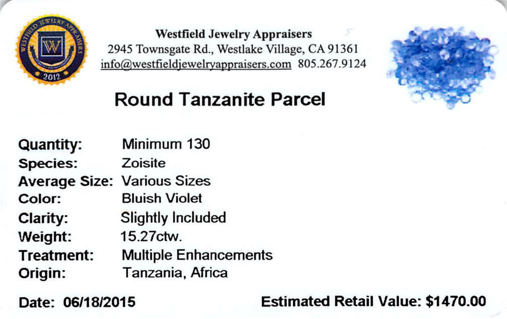 One hundred thirty round mixed cut natural tanzanites exact total weight 15.27ct., clarity is slightly included, type I, medium dark, very slightly grayish, bluish violet color, (GIA bV 6/3), cut is good. Transmitting light with a minimum of distortion, transparent. Naturally occurring internal & external characteristics are present. Color grade is an average for the group. Tanzanite is a very rare gemstone that is only found in the country of Tanzania. Originally discovered in 1967. Tiffany & Company, named the stone Tanzanite. It is found in the Usumburu Mountains that border the Umba Valley of northern Tanzania. Tanzanite occurs in gray, brown, violet, blue, reddish-purple, & green. The gem is interesting because of its exceptional pleochroism. Rotated in different directions a tanzanite will exhibit multiple changes of color. Tanzanite has a low tolerance to ultrasonic cleaning, and should not be cleaned using this method. Westfield Appraised at $1,470.00.