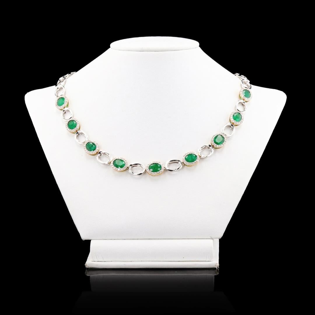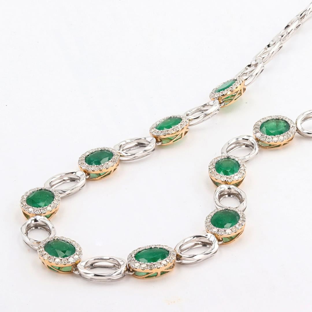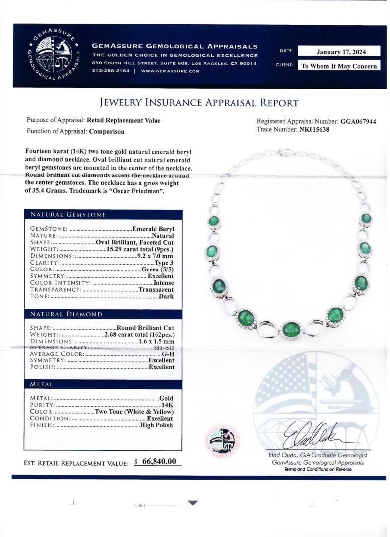 Fourteen karat (14K) two tone gold natural emerald beryl and diamond necklace. Oval brilliant cut natural emerald beryl gemstones are mounted in the center of the necklace. Round brilliant cut diamonds accent the necklace around the center gemstones. The necklace has a gross weight of 35.4 Grams. Trademark is "Oscar Friedman". #NATURAL GEMSTONE# GEMSTONE: Emerald Beryl NATURE: Natural SHAPE: Oval Brilliant, Faceted Cut WEIGHT: 15.29 carat total (9pcs.) DIMENSIONS: 9.2 x 7.0mm CLARITY: Type 3 COLOR: Green (5/5) SYMMETRY: Excellent COLOR INTENSITY: Intense TRANSPARENCY: Transparent TONE: Dark #NATURAL DIAMOND# SHAPE Round Brilliant Cut WEIGHT: 2.68 carat total (162pcs.) DIMENSIONS: 1.6 x 1.5mm AVERAGE CLARITY: SI1-SI2 AVERAGE COLOR: G-H SYMMETRY: Excellent POLISH: Excellent #METAL# METAL: Gold PURITY: 14K COLOR: Two Tone (White & Yellow) CONDITION: Excellent FINISH: High Polish #LREF-19113