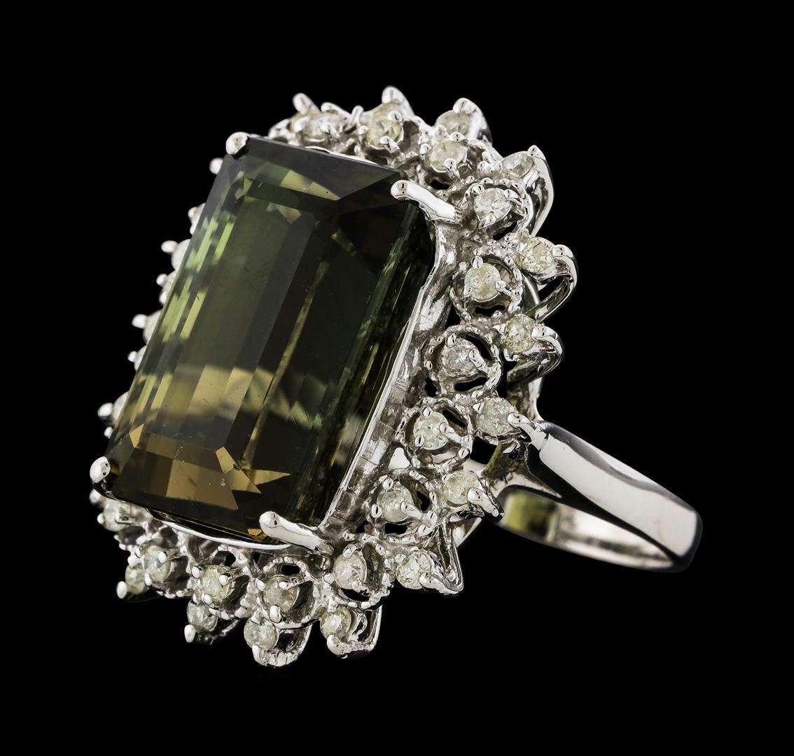 One 14KT White Gold Lady's Ring, Natural Green Tourmaline. Containing: Gold & Weight: 14KT White Gold, 9.10 grams. Main Gemstones: Identity: Natural Green Tourmaline. Carat Weight: 15.32 cts tw. Shape & Measurement: Emerald Cut. Approx: 15.70 x 10.93 mm. Quality: Fine medium color. Adjacent Gemstones: Identity: Natural Diamond. Shape: Round Brilliant Cut. Carat Weight: 0.57 cts tw. Quality: I Clarity, H-I Color. All fine cutting and proportions. Total Gemstones Weight: 15.89 cts tw. RBGS Appraised.