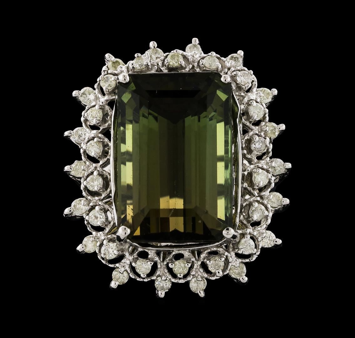 One 14KT White Gold Lady's Ring, Natural Green Tourmaline. Containing: Gold & Weight: 14KT White Gold, 9.10 grams. Main Gemstones: Identity: Natural Green Tourmaline. Carat Weight: 15.32 cts tw. Shape & Measurement: Emerald Cut. Approx: 15.70 x 10.93 mm. Quality: Fine medium color. Adjacent Gemstones: Identity: Natural Diamond. Shape: Round Brilliant Cut. Carat Weight: 0.57 cts tw. Quality: I Clarity, H-I Color. All fine cutting and proportions. Total Gemstones Weight: 15.89 cts tw. RBGS Appraised.