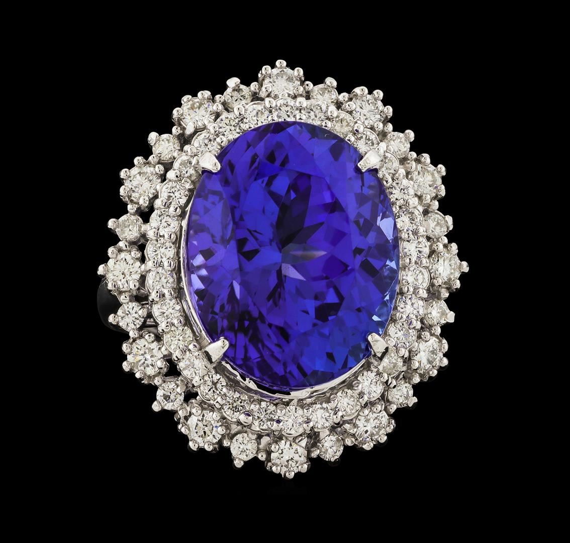 One electronically tested 14KT white gold lady's cast fashion ring with a staggered double basket halo with a bright polish finish. The featured lady's ring has a shank measuring 3.01 millimeters wide. Identified with markings of 'K14'. Condition is new, good workmanship. Containing: One prong set oval modified brilliant cut natural tanzanite, measuring 15.95 x 12.70 x 10.54mm, (depth est.) approximate weight of 15.33ct., clarity is eye clean, medium dark, moderately strong, violetish blue color, (GIA vB 6/4), cut is very good. Transmitting light with no distortion, transparent. Colored gemstones are presumed to have been subjected to commonly used enhancement processes. Graded in the setting. Twelve prong set round brilliant cut diamonds, measuring 2.20 - 2.10 x 1.33mm (depth est.) approximate total weight of 12 Stones = 0.45ct. Graded in the setting. Clarity SI-1 to SI-2. Color: G - H Cut Good Forty-Two prong set round brilliant cut diamonds, measuring 1.70 - 1.60 x 1.01mm (depth est.) approximate total weight of 42 Stones = 0.70ct. Graded in the setting. Clarity SI-1 to SI-2. Color: G - I Cut Good. Total Weight of Colored Stones 15.33ct.. Total Weight of Diamonds 1.15ct.. Total Weight of Ring 11.30gm GAS Appraised at $27,810.00.