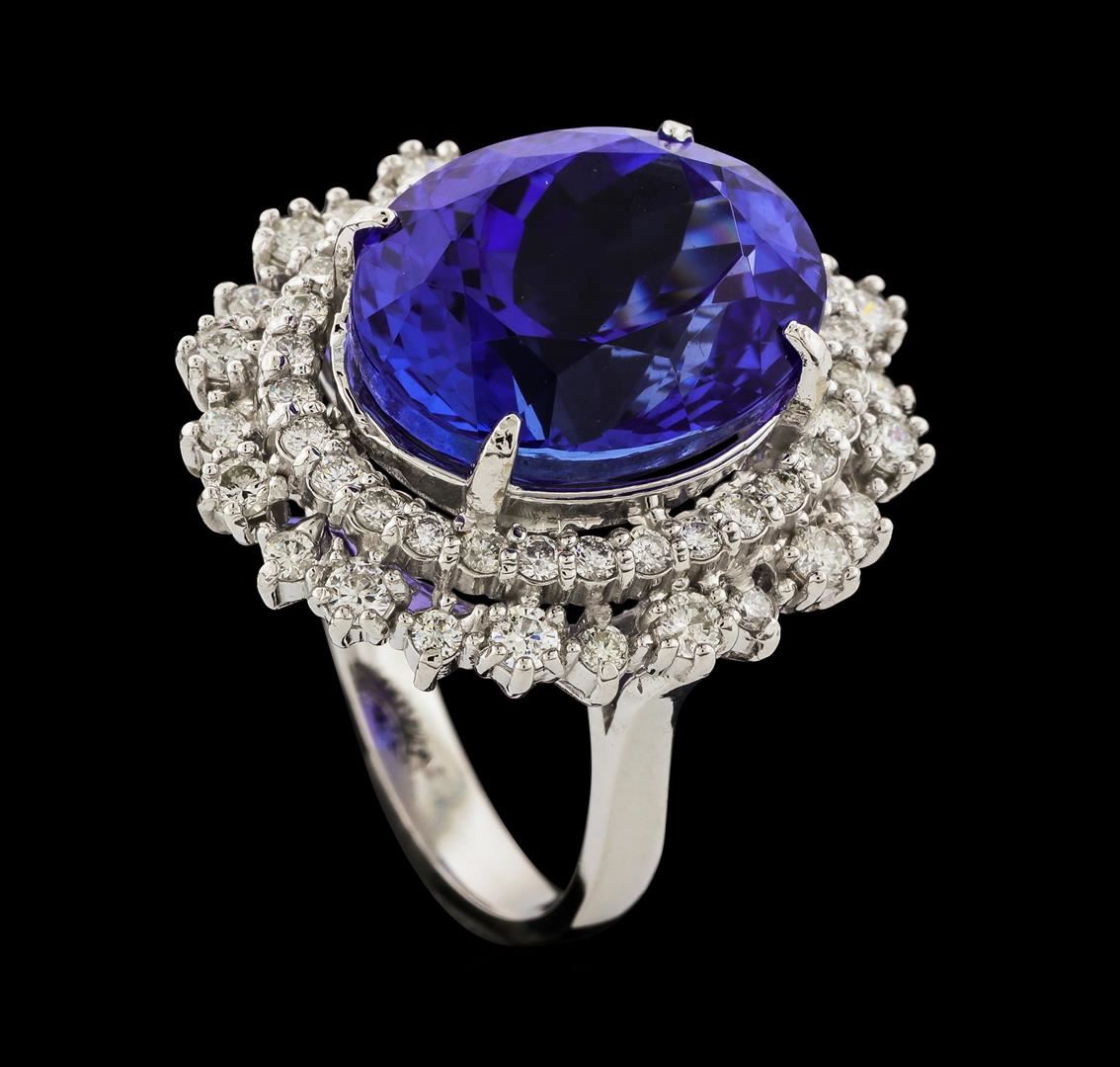 One electronically tested 14KT white gold lady's cast fashion ring with a staggered double basket halo with a bright polish finish. The featured lady's ring has a shank measuring 3.01 millimeters wide. Identified with markings of 'K14'. Condition is new, good workmanship. Containing: One prong set oval modified brilliant cut natural tanzanite, measuring 15.95 x 12.70 x 10.54mm, (depth est.) approximate weight of 15.33ct., clarity is eye clean, medium dark, moderately strong, violetish blue color, (GIA vB 6/4), cut is very good. Transmitting light with no distortion, transparent. Colored gemstones are presumed to have been subjected to commonly used enhancement processes. Graded in the setting. Twelve prong set round brilliant cut diamonds, measuring 2.20 - 2.10 x 1.33mm (depth est.) approximate total weight of 12 Stones = 0.45ct. Graded in the setting. Clarity SI-1 to SI-2. Color: G - H Cut Good Forty-Two prong set round brilliant cut diamonds, measuring 1.70 - 1.60 x 1.01mm (depth est.) approximate total weight of 42 Stones = 0.70ct. Graded in the setting. Clarity SI-1 to SI-2. Color: G - I Cut Good. Total Weight of Colored Stones 15.33ct.. Total Weight of Diamonds 1.15ct.. Total Weight of Ring 11.30gm GAS Appraised at $27,810.00.