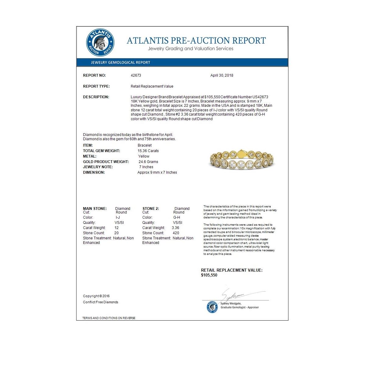 REF-2399W3F -42673 ---- 15.36 CTW Diamond Designer Bracelet 18K Yellow Gold ---- Luxury Designer Brand Bracelet Appraised at $105,550 Certificate Number US42673 18K Yellow gold, Bracelet Size is 7 Inches, Bracelet measuring approx. 9 mm x 7 Inches, weighing in total approx. 22 grams. Made in the USA and is stamped 18K, Main stone 12 carat total weight containing 20 pieces of I-J color with VS/SI quality Round shape cut Diamond , Stone #2 3.36 carat total weight containing 420 pieces of G-H color with VS/SI quality Round shape cut Diamond