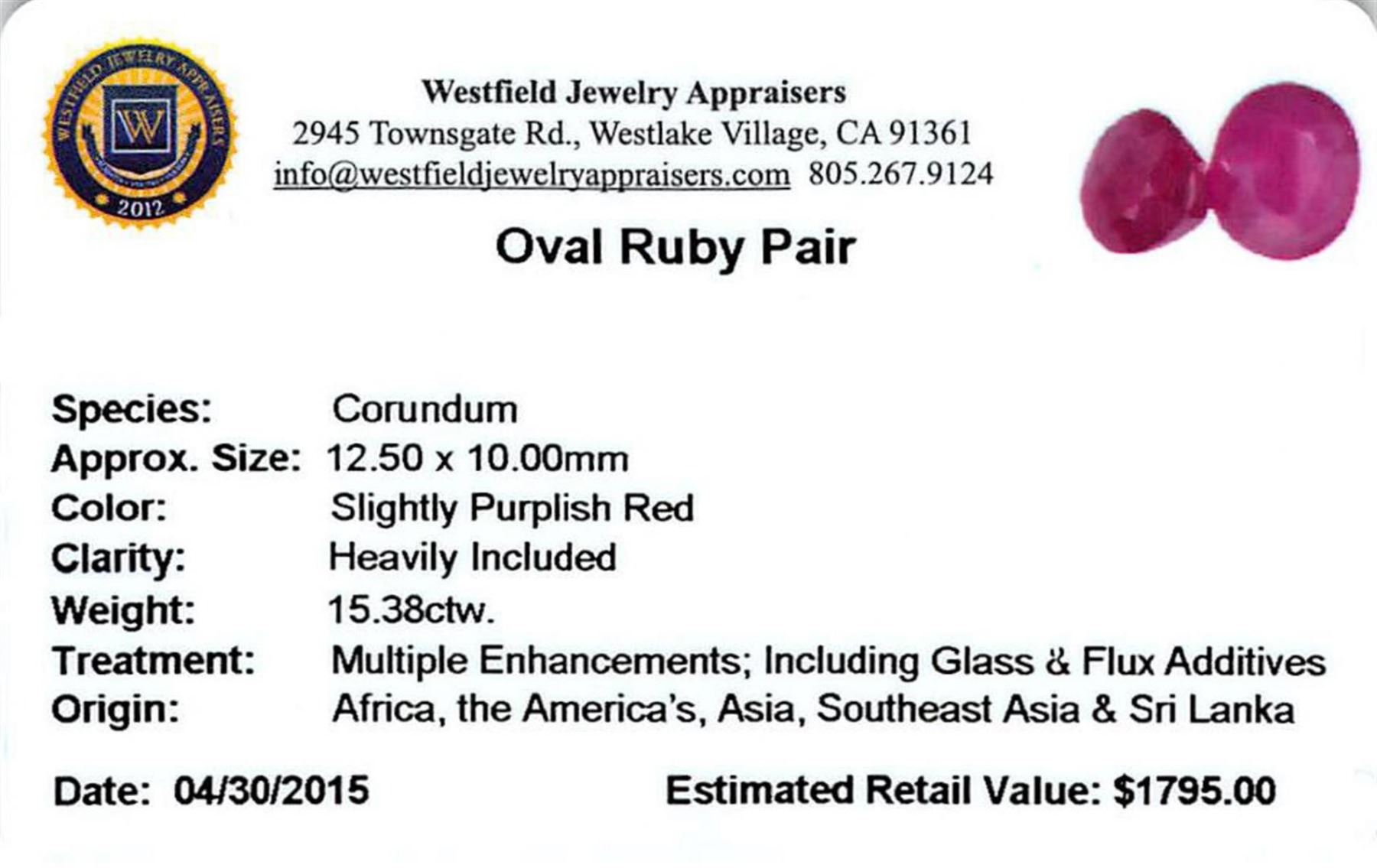 Two oval mixed cut natural rubies, measuring 12.50 x 10.00 x 5.70mm, exact total weight 15.38ct., clarity is heavily included, type II, dark, very slightly brownish, slightly purplish red color, (GIA slpR 7/3), cut is good. Transmitting light somewhat diffusely, translucent. Naturally occurring internal & external characteristics are present. Indications of laboratory high temperature heat treatment, with glass & flux additives. Ruby has a low tolerance to rhodium plating, repolishing the surface, & ultrasonic cleaning. Westfield Appraised.