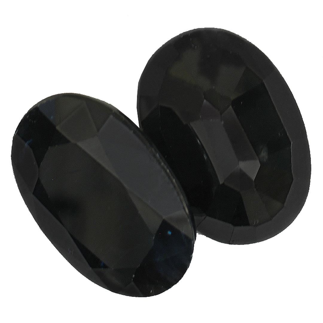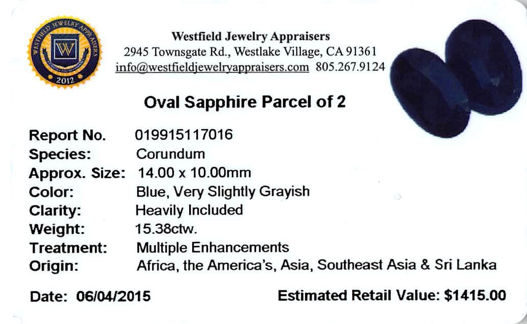 Two oval mixed cut natural blue sapphires, measuring 14.00 x 10.00 x 6.50mm, exact total weight 15.38ct., clarity is heavily included, type II, very dark, very slightly grayish, blue color, (GIA B 8/3), cut is good. Measurements are an average for the group. Transmitting light very diffusely, opaque, Naturally occurring internal & external characteristics are present, Indications of multiple laboratory enhancements, including high temperature heat treatment. Westfield Appraised at $1,415.00.