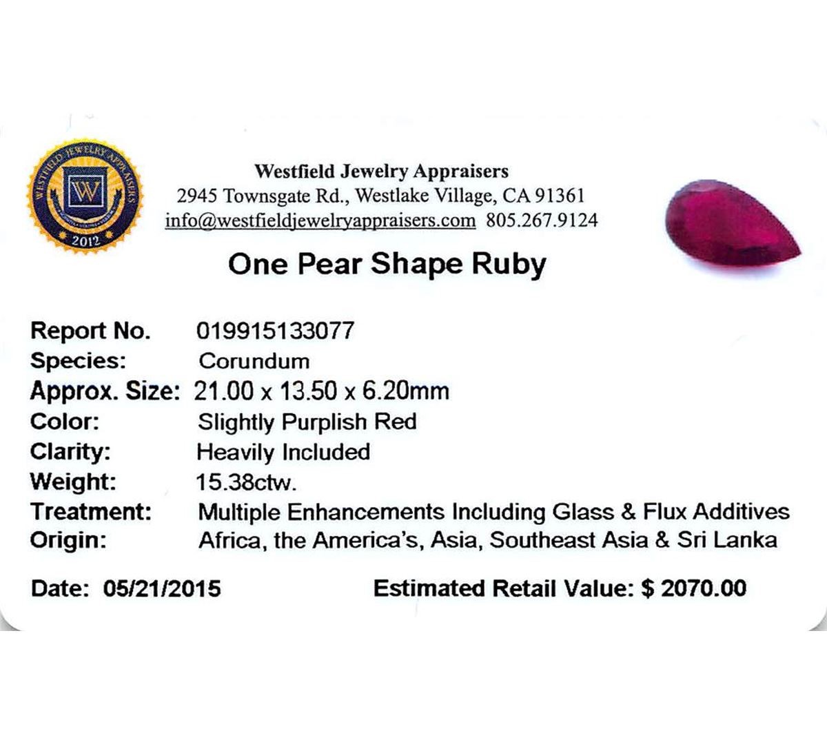 One pear mixed cut natural ruby, measuring 21.00 x 13.50 x 6.20mm, exact weight 15.38ct., clarity is heavily included, type II, medium dark, very slightly brownish, slightly purplish red color, (GIA slpR 6/3), cut is good. Transmitting light somewhat diffusely, transparent to translucent. Naturally occurring internal & external characteristics are present. Indications of laboratory high temperature heat treatment, with glass & flux additives. Ruby has a low tolerance to rhodium plating, repolishing the surface, & ultrasonic cleaning. Westfield Appraised at $2,070.00.