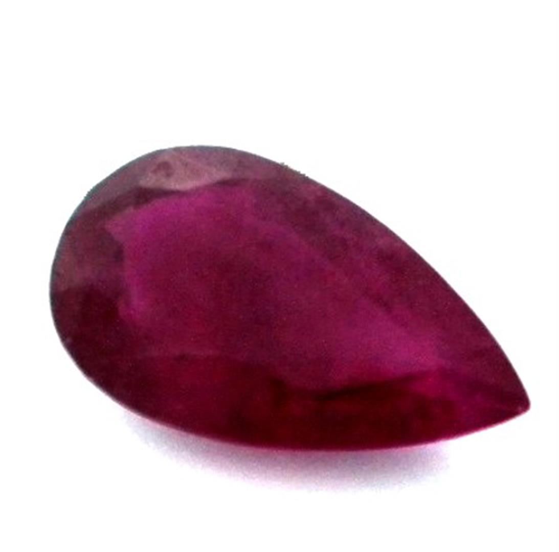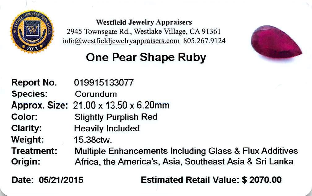 One pear mixed cut natural ruby, measuring 21.00 x 13.50 x 6.20mm, exact weight 15.38ct., clarity is heavily included, type II, medium dark, very slightly brownish, slightly purplish red color, (GIA slpR 6/3), cut is good. Transmitting light somewhat diffusely, transparent to translucent. Naturally occurring internal & external characteristics are present. Indications of laboratory high temperature heat treatment, with glass & flux additives. Ruby has a low tolerance to rhodium plating, repolishing the surface, & ultrasonic cleaning. Westfield Appraised at $2,070.00.