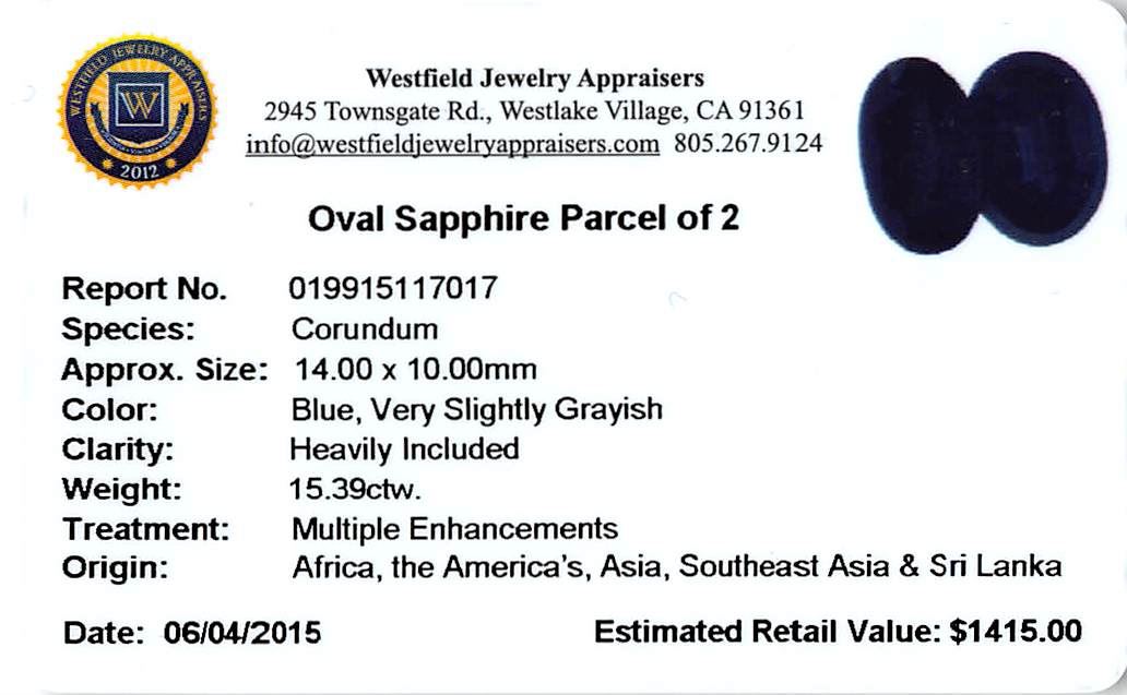 Two oval mixed cut natural blue sapphires, measuring 14.00 x 10.00 x 6.50mm, exact total weight 15.39ct., clarity is heavily included, type II, very dark, very slightly grayish, blue color, (GIA B 8/3), cut is good. Measurements are an average for the group. Transmitting light very diffusely, opaque, Naturally occurring internal & external characteristics are present, Indications of multiple laboratory enhancements, including high temperature heat treatment. Westfield Appraised at $1,415.00.