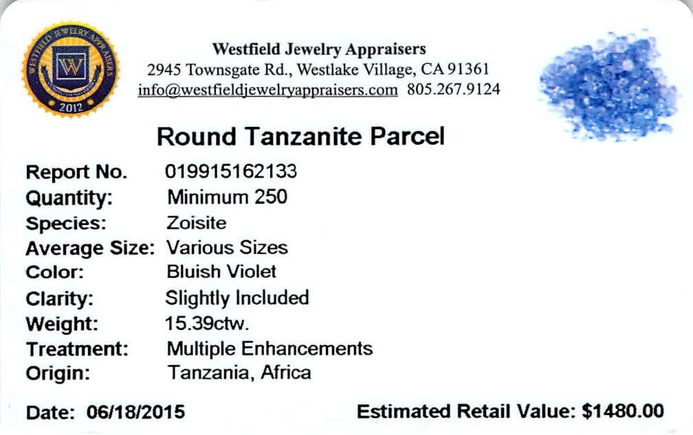 Two hundred fifty round mixed cut natural tanzanites exact total weight 15.39ct., clarity is slightly included, type I, medium dark, very slightly grayish, bluish violet color, (GIA bV 6/3), cut is good. Transmitting light with a minimum of distortion, Westfield Appraised at $1,480.00.