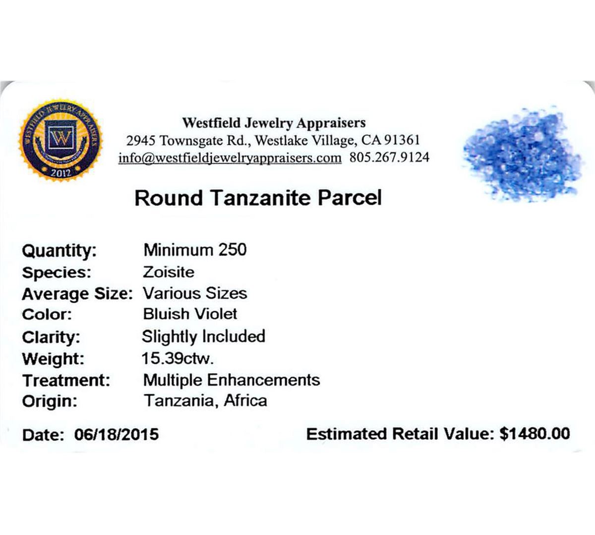 Two hundred fifty round mixed cut natural tanzanites exact total weight 15.39ct., clarity is slightly included, type I, medium dark, very slightly grayish, bluish violet color, (GIA bV 6/3), cut is good. Transmitting light with a minimum of distortion, transparent. Naturally occurring internal & external characteristics are present. Color grade is an average for the group. Tanzanite is a very rare gemstone that is only found in the country of Tanzania. Originally discovered in 1967. Tiffany & Company, named the stone Tanzanite. It is found in the Usumburu Mountains that border the Umba Valley of northern Tanzania. Tanzanite occurs in gray, brown, violet, blue, reddish-purple, & green. The gem is interesting because of its exceptional pleochroism. Rotated in different directions a tanzanite will exhibit multiple changes of color. Tanzanite has a low tolerance to ultrasonic cleaning, and should not be cleaned using this method. Westfield Appraised at $1,480.00.