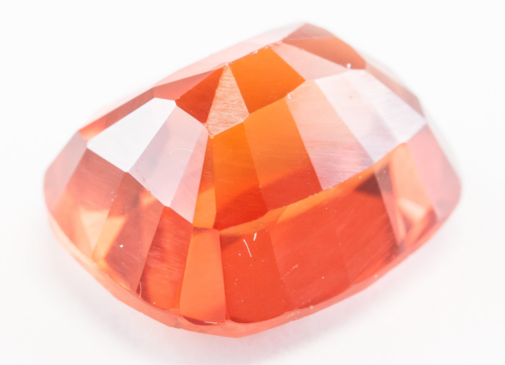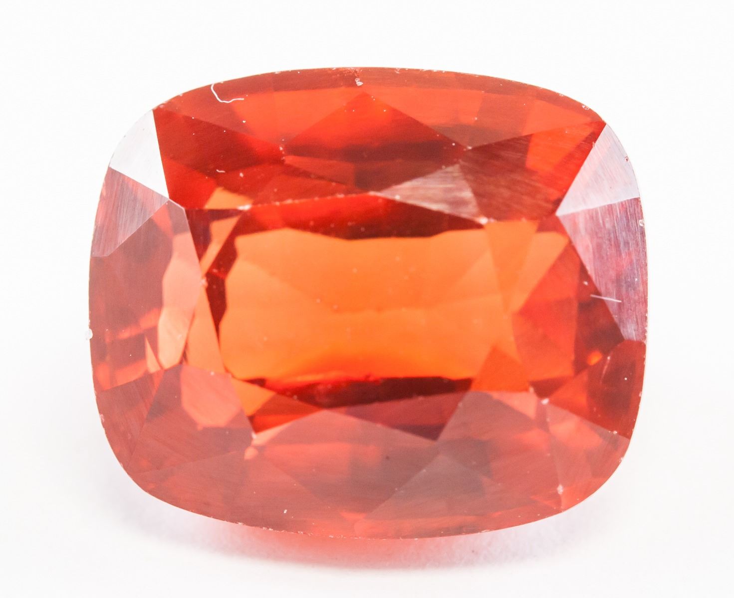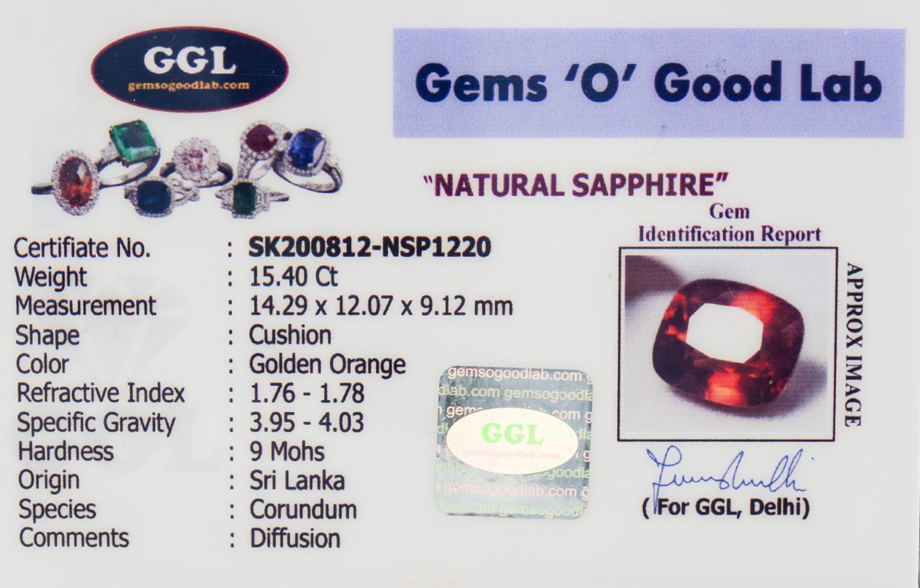 One (1) 15.40 ct cushion cut golden orange natural sapphire. Origin: Sri Lanka. Accompanied with GGL certificate. 14.29 x 12.07 x 9.12 mm.