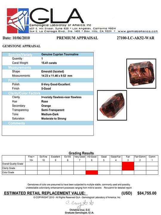 Excellent rose orange color RARE copper-bearing specimen emerald cut: COPPER in tourmaline is rare and highly prized, it makes the stone color much more vivid (sometimes neon-like) and causes the stone to mimick the reflectivity of diamond; lab quality ev