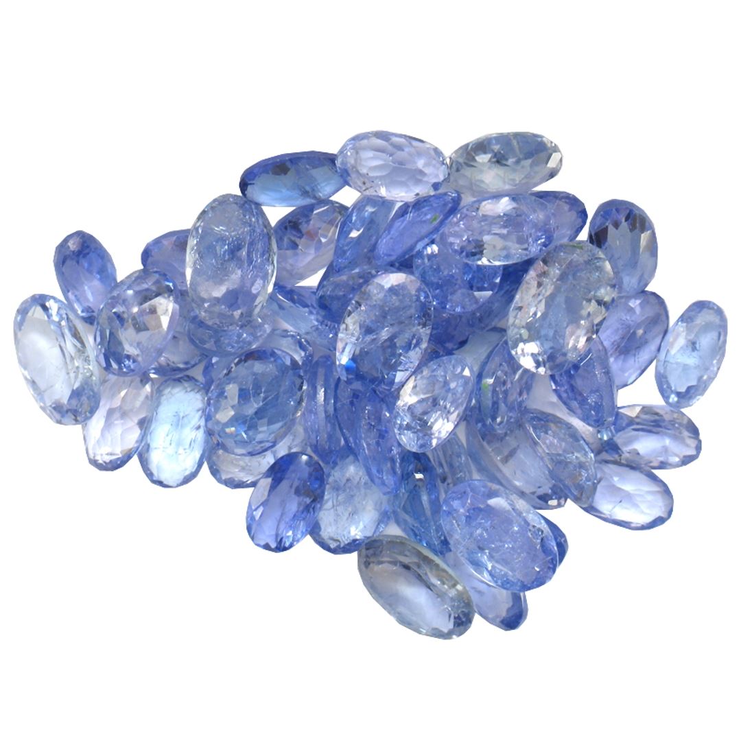 Forty oval mixed cut natural tanzanites exact total weight 15.41ct., clarity is slightly included, type I, medium dark, very slightly grayish, violetish blue color, (GIA vB 6/3), cut is good. Measurements & the color grade are an average for the group, Color grade is an average for the group, Naturally occurring internal & external characteristics are present, Indications of laboratory high temperature heat treatment. Westfield Appraised at $1,485.00.