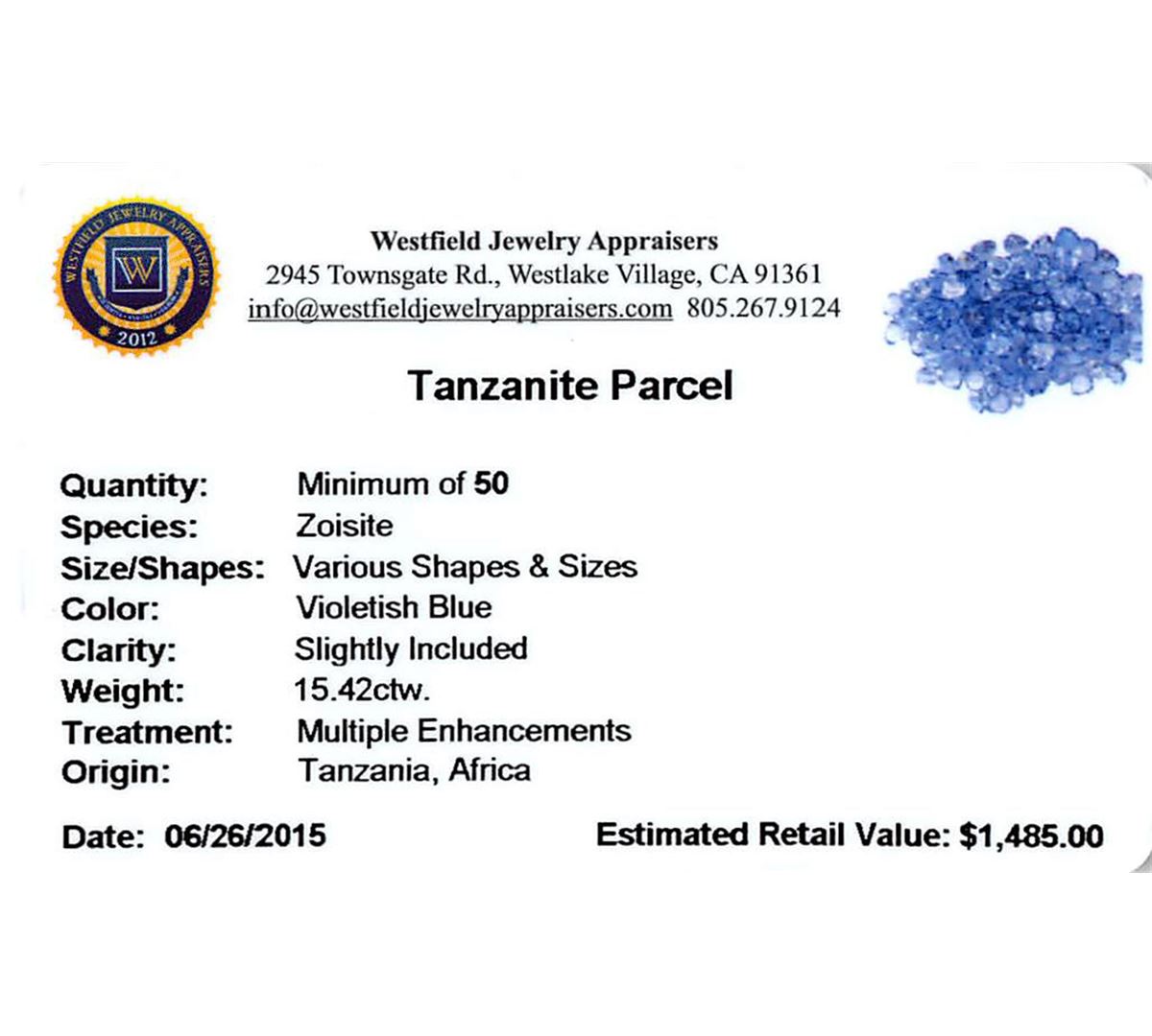 Fifty round mixed cut natural tanzanites, measuring 3.00 - 3.00 x 1.95 mm, exact total weight 15.42ct., clarity is slightly included, type I, medium, very slightly grayish, violetish blue color, (GIA vB 5/3), cut is good. Measurements & the color grade are an average for the group, Color grade is an average for the group, Transmitting light with no distortion, transparent, Naturally occurring internal & external characteristics are present, Indications of multiple laboratory enhancements, including high temperature heat treatment. Westfield Appraised at $1,485.00.