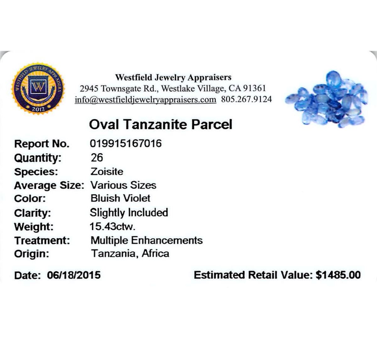 Twenty-six oval mixed cut natural tanzanites exact total weight 15.43ct., clarity is slightly included, type I, medium dark, very slightly grayish, bluish violet color, (GIA bV 6/3), cut is good. Transmitting light with a minimum of distortion, transparent. Naturally occurring internal & external characteristics are present. Color grade is an average for the group. Tanzanite is a very rare gemstone that is only found in the country of Tanzania. Originally discovered in 1967. Tiffany & Company, named the stone Tanzanite. It is found in the Usumburu Mountains that border the Umba Valley of northern Tanzania. Tanzanite occurs in gray, brown, violet, blue, reddish-purple, & green. The gem is interesting because of its exceptional pleochroism. Rotated in different directions a tanzanite will exhibit multiple changes of color. Tanzanite has a low tolerance to ultrasonic cleaning, and should not be cleaned using this method. Westfield Appraised at $1,485.00.
