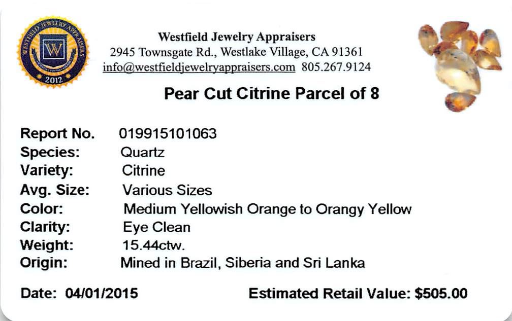Eight pear mixed cut natural citrine quartzs exact total weight 15.44ct., clarity is eye clean, type I, medium dark, brownish, yellowish orange color, (GIA yO 6/3), cut is good. Westfield Appraised at $505.00.