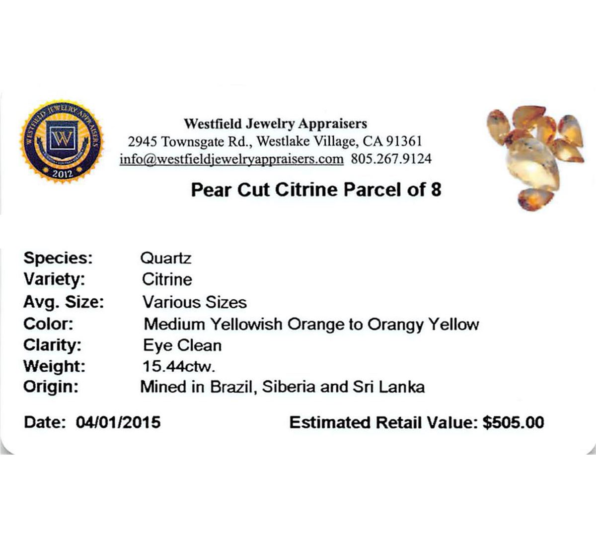 Eight pear mixed cut natural citrine quartzs exact total weight 15.44ct., clarity is eye clean, type I, medium dark, brownish, yellowish orange color, (GIA yO 6/3), cut is good. UGS Appraised at $505.00.