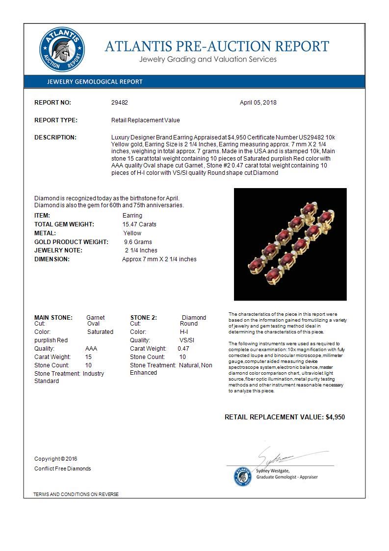 REF-74W8F -29482 ---- 15.47 CTW Garnet & VS/SI Certified Diamond Tennis Earrings 10K Yellow Gold ---- Luxury Designer Brand Earring Appraised at $4,950 Certificate Number US29482 10k Yellow gold, Earring Size is 2 1/4 Inches, Earring measuring approx. 7 mm X 2 1/4 inches, weighing in total approx. 7 grams. Made in the USA and is stamped 10k, Main stone 15 carat total weight containing 10 pieces of Saturated purplish Red color with AAA quality Oval shape cut Garnet , Stone #2 0.47 carat total weight containing 10 pieces of H-I color with VS/SI quality Round shape cut Diamond