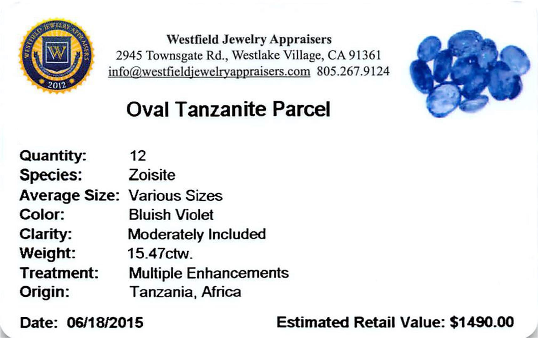 Twelve oval mixed cut natural tanzanites exact total weight 15.47ct., clarity is moderately included, type I, medium dark, very slightly grayish, bluish violet color, (GIA bV 6/3), cut is good. Transmitting light with a minimum of distortion, transparent. Naturally occurring internal & external characteristics are present. Color grade is an average for the group. Tanzanite is a very rare gemstone that is only found in the country of Tanzania. Originally discovered in 1967. Tiffany & Company, named the stone Tanzanite. It is found in the Usumburu Mountains that border the Umba Valley of northern Tanzania. Tanzanite occurs in gray, brown, violet, blue, reddish-purple, & green. The gem is interesting because of its exceptional pleochroism. Rotated in different directions a tanzanite will exhibit multiple changes of color. Tanzanite has a low tolerance to ultrasonic cleaning, and should not be cleaned using this method. Westfield Appraised at $1,490.00.