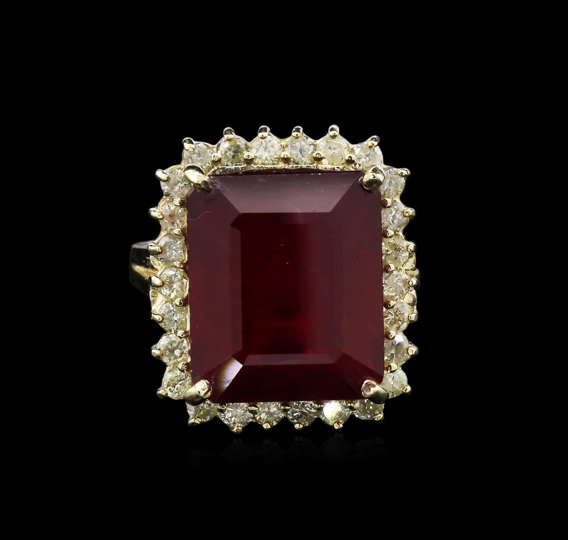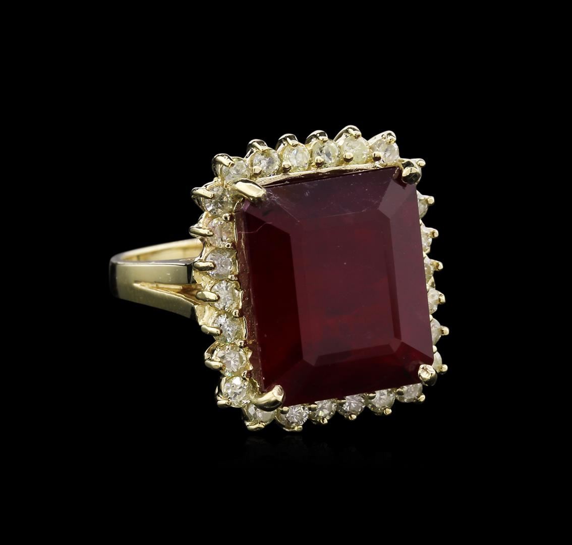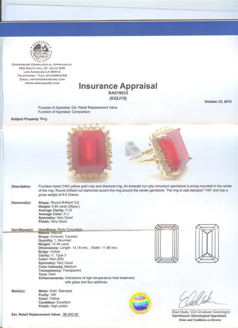 Fourteen karat (14K) yellow gold ruby and diamond ring. An emerald cut ruby corundum gemstone is prong mounted in the center of the ring. Round brilliant cut diamonds accent the ring around the center gemstone. The ring is cast stamped "14K" and has a gross weight of 9.0 Grams. Diamond(s): Shape: Round Brilliant Cut. Weight: 0.84 carat (26pcs). Average Clarity: I1-I2. Average Color: H-J. Symmetry: Very Good. Polish: Very Good. GemStone(s): Ruby Corundum. Nature: Natural. Shape: Emerald, Faceted. Quantity: 1, Mounted. Weight: 15.48 carat. Dimensions: Length- 14.19 mm. ; Width 11.98 mm. Bulge: Visible. Clarity: I1, Type 3. Color: Red (5/5). Symmetry: Very Good. Color Intensity: Medium. Transparency: Transparent. Tone: Dark. Enhancements: Indications of high temperature heat treatment, with glass and flux additives. Metal(s): Metal: Gold, Stamped. Purity: 14K. Color: Yellow. Condition: Excellent. Finish: High polish. GGA Appraised at $6,940.00.