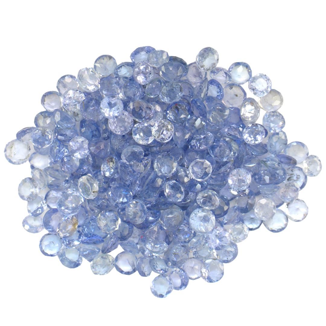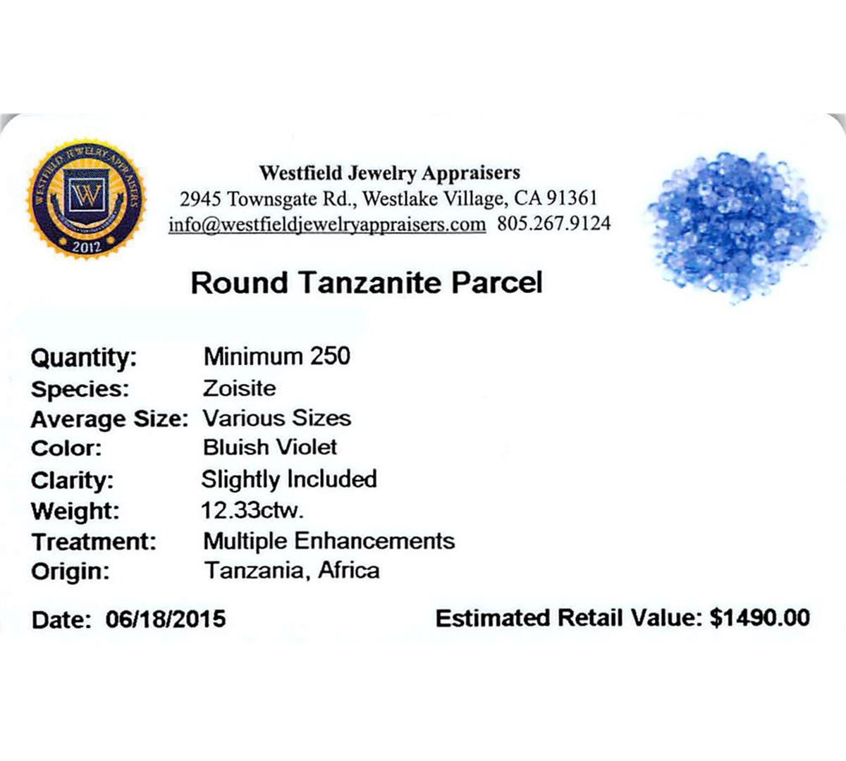 Two hundred fifty round mixed cut natural tanzanites exact total weight 15.49ct., clarity is slightly included, type I, medium dark, very slightly grayish, bluish violet color, (GIA bV 6/3), cut is good. Transmitting light with a minimum of distortion, transparent. Naturally occurring internal & external characteristics are present. Color grade is an average for the group. Tanzanite is a very rare gemstone that is only found in the country of Tanzania. Originally discovered in 1967. Tiffany & Company, named the stone Tanzanite. It is found in the Usumburu Mountains that border the Umba Valley of northern Tanzania. Tanzanite occurs in gray, brown, violet, blue, reddish-purple, & green. The gem is interesting because of its exceptional pleochroism. Rotated in different directions a tanzanite will exhibit multiple changes of color. Tanzanite has a low tolerance to ultrasonic cleaning, and should not be cleaned using this method. Westfield Appraised at $1,490.00.