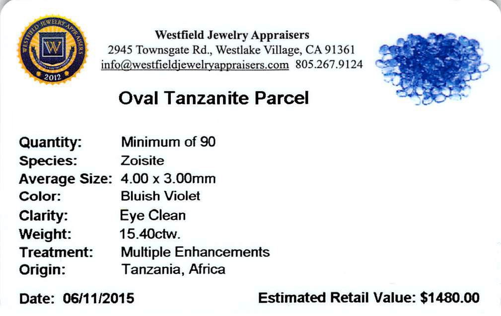Ninety oval mixed cut natural tanzanites, measuring 4.00 x 3.00 x 1.95mm, exact total weight 15.40ct., clarity is eye clean, type I, medium dark, very slightly grayish, bluish violet color, (GIA bV 6/3), cut is good. Transmitting light with no distortion, transparent. Color grade is an average for the group. Graded in the setting. Tanzanite is a very rare gemstone that is only found in the country of Tanzania. Originally discovered in 1967. Tiffany & Company, named the stone Tanzanite. It is found in the Usumburu Mountains that border the Umba Valley of northern Tanzania. Tanzanite occurs in gray, brown, violet, blue, reddish-purple, & green. The gem is interesting because of its exceptional pleochroism. Rotated in different directions a tanzanite will exhibit multiple changes of color. Tanzanite has a low tolerance to ultrasonic cleaning, and should not be cleaned using this method. Westfield Appraised at $1,480.00.