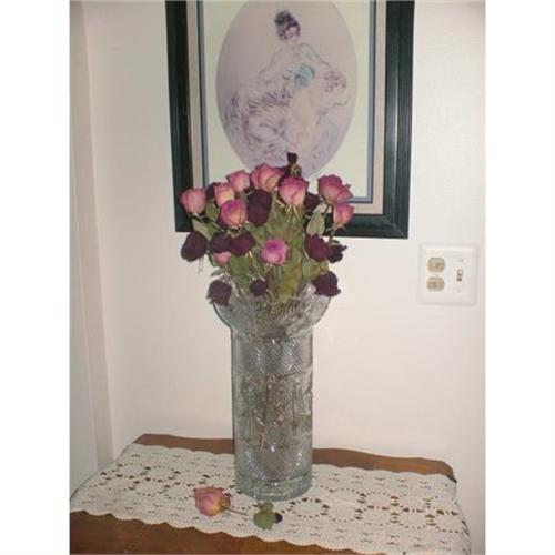 CUT CRYSTAL FLOWER VASE: This beautiful vase is tall enough to strikingly display any flowers. It is in excellent condition. The carving is deep and quite lovely. I have tried to show a picture close enough to see the intricate pattern. The weight of this vase is about eleven pounds without a box or wrapping. It is indeed excellent quality. The shipping is fifteen dollars. The age is estimated. The measurements and weight are approximate. The flowers are not included. If you have any questions, please send an email. I will answer. Thank you for your interest in this grand vase.
