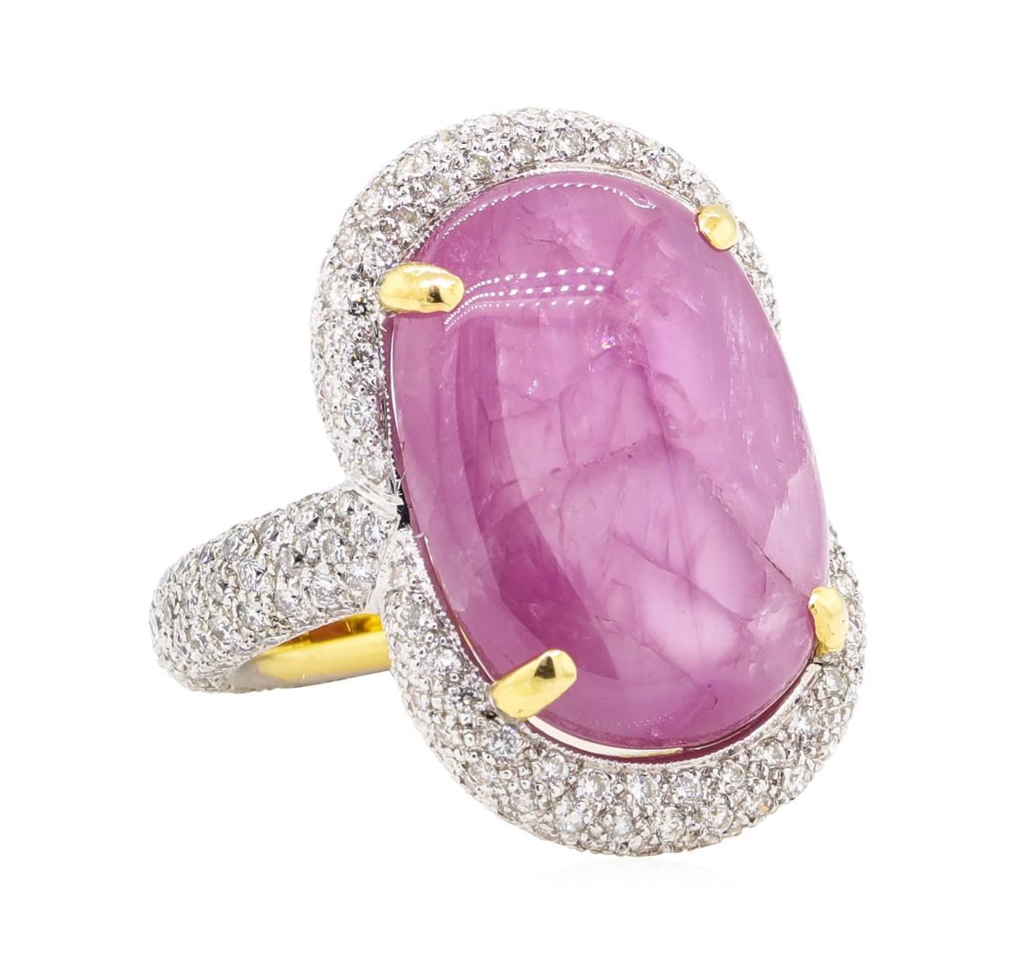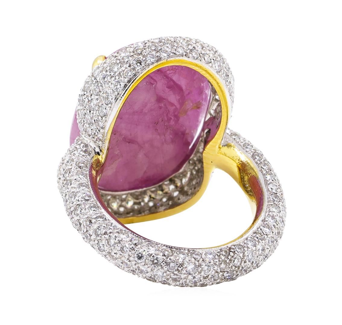 One electronically tested 18KT yellow with rhodium plating gold lady's cast fashion ring with a bright polish with milgrain detailing finish. The featured lady's ring has a shank measuring 3.98 millimeters wide. Condition is new, good workmanship. Containing: One prong set oval cabochon standard cut natural ruby, measuring 18.75 x 13.75 x 5.57mm, (depth est.) approximate weight of 15.50ct., clarity is severely included, medium light, slightly brownish, red color, (GIA R 4/2), cut is good. Transmitting light diffusely, opaque to translucent. Colored gemstones are presumed to have been subjected to commonly used enhancement processes. Graded in the setting. Two Hundred Sixty-Seven prong set round brilliant cut diamonds, measuring 1.20 - 1.00 x 0.68mm (depth est.) approximate total weight of 267 Stones = 1.35ct. Graded in the setting. Color G - H Clarity VS-2 to SI-2 Cut Good. Total Weight of Colored Stones 15.50ct.. Total Weight of Diamonds 1.35ct.. Total Weight of Ring 10.50gm GAS Appraised at $8425.00. GAS Appraised.