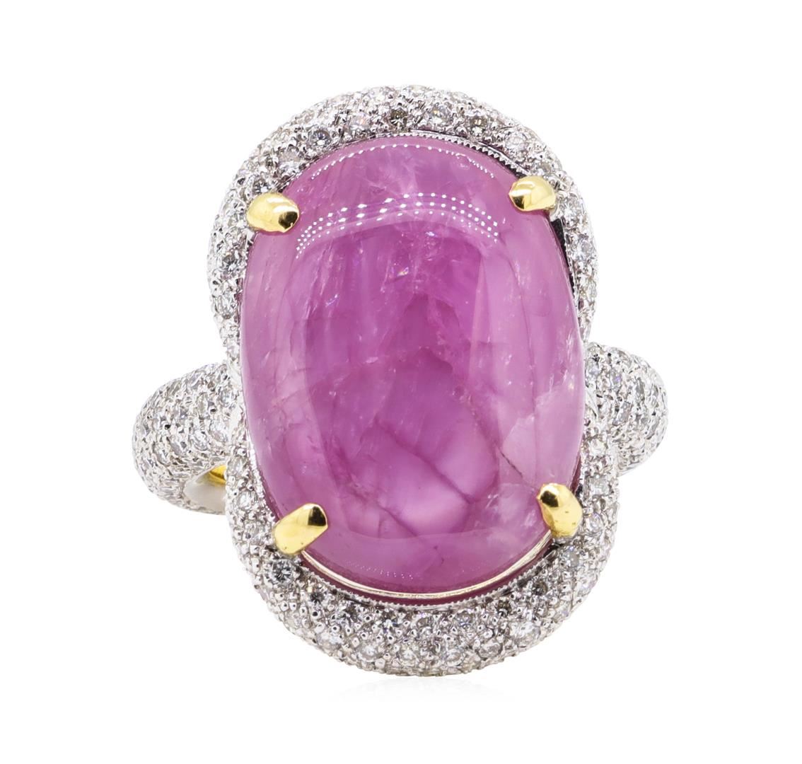 One electronically tested 18KT yellow with rhodium plating gold lady's cast fashion ring with a bright polish with milgrain detailing finish. The featured lady's ring has a shank measuring 3.98 millimeters wide. Condition is new, good workmanship. Containing: One prong set oval cabochon standard cut natural ruby, measuring 18.75 x 13.75 x 5.57mm, (depth est.) approximate weight of 15.50ct., clarity is severely included, medium light, slightly brownish, red color, (GIA R 4/2), cut is good. Transmitting light diffusely, opaque to translucent. Colored gemstones are presumed to have been subjected to commonly used enhancement processes. Graded in the setting. Two Hundred Sixty-Seven prong set round brilliant cut diamonds, measuring 1.20 - 1.00 x 0.68mm (depth est.) approximate total weight of 267 Stones = 1.35ct. Graded in the setting. Color G - H Clarity VS-2 to SI-2 Cut Good. Total Weight of Colored Stones 15.50ct.. Total Weight of Diamonds 1.35ct.. Total Weight of Ring 10.50gm GAS Appraised at $8425.00. GAS Appraised.