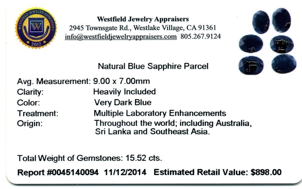 15.52cts Oval Cut Natural Blue Sapphire Parcel. Westfield Appraised at $898.00.