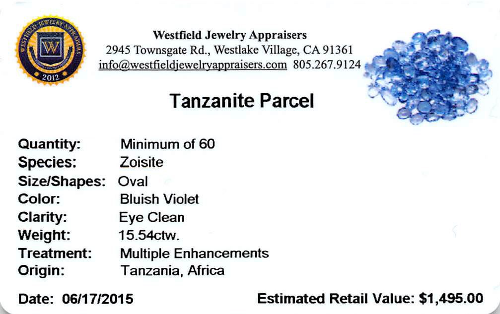 Sixty oval mixed cut natural tanzanites exact total weight 15.54ct., clarity is slightly included, type I, medium dark, slightly grayish, violetish blue color, (GIA vB 6/2), cut is good. Measurements & the color grade are an average for the group, Color grade is an average for the group, Transmitting light with no distortion, transparent, Indications of laboratory high temperature heat treatment. Westfield Appraised at $1,495.00.