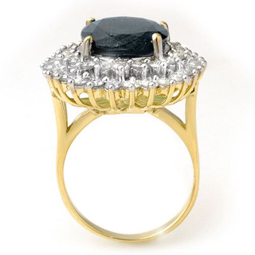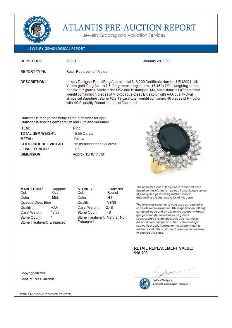 REF-236W4F -12991 ---- 15.55 CTW Blue Sapphire & Diamond Ring 14K Yellow Gold ---- Luxury Designer Brand Ring Appraised at $18,200 Certificate Number US12991 14k Yellow gold, Ring Size is 7.5, Ring measuring approx. 15/16" x 7/8" , weighing in total approx. 9.5 grams. Made in the USA and is stamped 14k, Main stone 13.07 carat total weight containing 1 pieces of Mid-Opaque-Deep Blue color with AAA quality Oval shape cut Sapphire , Stone #2 2.48 carat total weight containing 46 pieces of H-I color with VS/SI quality Round shape cut Diamond