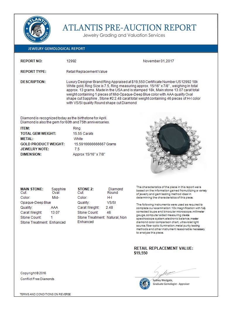 REF-253A8X -12992 ---- 15.55 CTW Blue Sapphire & Diamond Ring 18K White Gold ---- Luxury Designer Brand Ring Appraised at $19,550 Certificate Number US12992 18k White gold, Ring Size is 7.5, Ring measuring approx. 15/16" x 7/8" , weighing in total approx. 13 grams. Made in the USA and is stamped 18k, Main stone 13.07 carat total weight containing 1 pieces of Mid-Opaque-Deep Blue color with AAA quality Oval shape cut Sapphire , Stone #2 2.48 carat total weight containing 46 pieces of H-I color with VS/SI quality Round shape cut Diamond