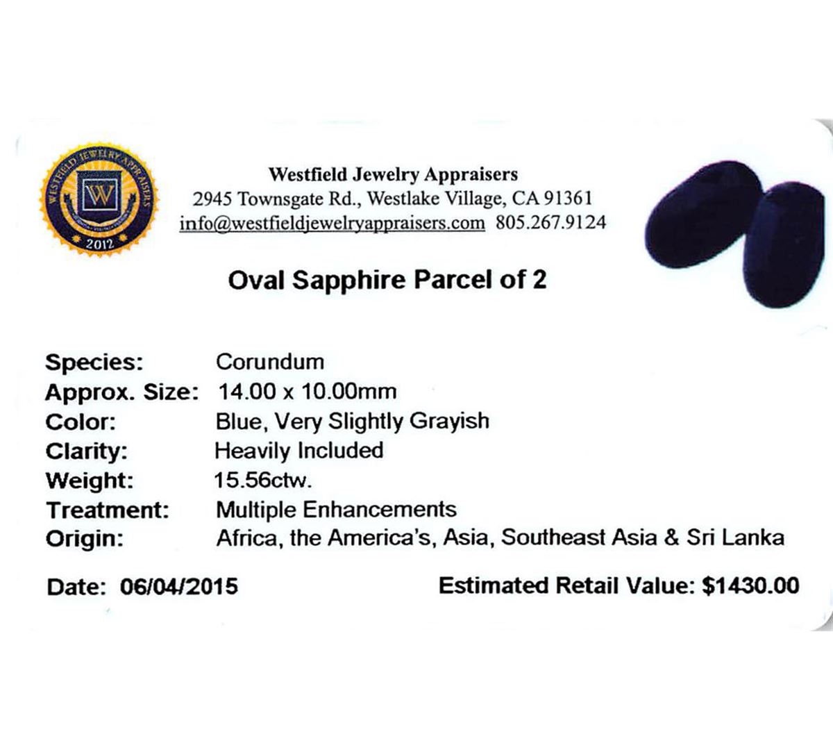 Two oval mixed cut natural blue sapphires, measuring 14.00 x 10.00 x 0.00mm, exact total weight 15.56ct., clarity is heavily included, type II, very dark, very slightly grayish, blue color, (GIA B 8/3), cut is good. Measurements are an average for the group. Transmitting light very diffusely, opaque, Naturally occurring internal & external characteristics are present, Indications of multiple laboratory enhancements, including high temperature heat treatment. Westfield Appraised at $1,430.00.