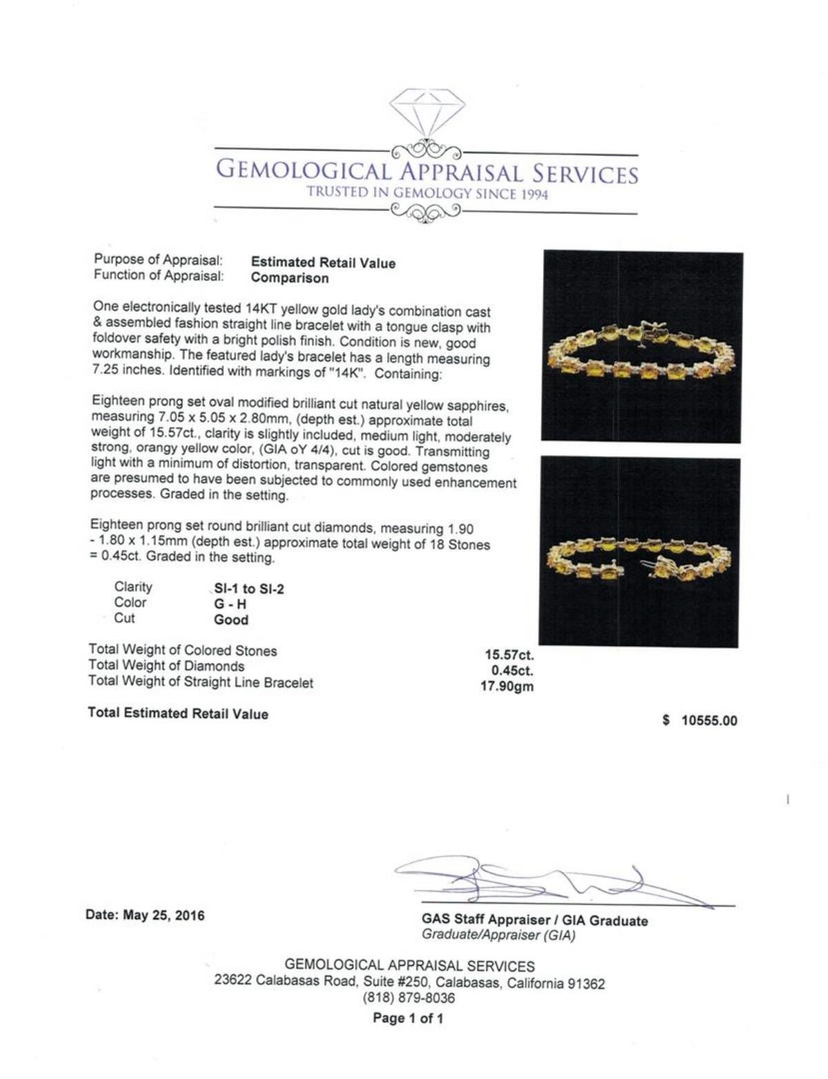 One electronically tested 14KT yellow gold lady's combination cast & assembled fashion straight line bracelet with a tongue clasp with foldover safety with a bright polish finish. The featured lady's bracelet has a length measuring 7.25 inches. Identified with markings of "14K". Condition is new, good workmanship. Containing: Eighteen prong set oval modified brilliant cut natural yellow sapphires, measuring 7.05 x 5.05 x 2.80mm, (depth est.) approximate total weight of 15.57ct., clarity is slightly included, medium light, moderately strong, orangy yellow color, (GIA oY 4/4), cut is good. Transmitting light with a minimum of distortion, transparent. Colored gemstones are presumed to have been subjected to commonly used enhancement processes. Graded in the setting. Eighteen prong set round brilliant cut diamonds, measuring 1.90 - 1.80 x 1.15mm (depth est.) approximate total weight of 18 Stones = 0.45ct. Graded in the setting. Clarity: SI-1 to SI-2. Color: G - H. Cut Good. Total Weight of Colored Stones 15.57ct. Total Weight of Diamonds 0.45ct. Total Weight of Straight Line Bracelet 17.90gm. GAS Appraised.