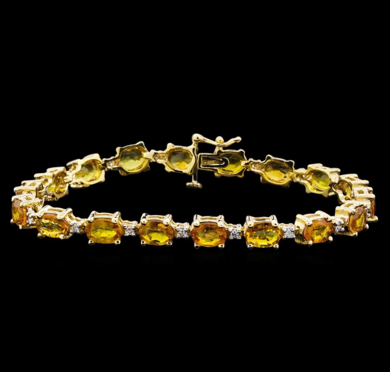One electronically tested 14KT yellow gold lady's combination cast & assembled fashion straight line bracelet with a tongue clasp with foldover safety with a bright polish finish. The featured lady's bracelet has a length measuring 7.25 inches. Identified with markings of "14K". Condition is new, good workmanship. Containing: Eighteen prong set oval modified brilliant cut natural yellow sapphires, measuring 7.05 x 5.05 x 2.80mm, (depth est.) approximate total weight of 15.57ct., clarity is slightly included, medium light, moderately strong, orangy yellow color, (GIA oY 4/4), cut is good. Transmitting light with a minimum of distortion, transparent. Colored gemstones are presumed to have been subjected to commonly used enhancement processes. Graded in the setting. Eighteen prong set round brilliant cut diamonds, measuring 1.90 - 1.80 x 1.15mm (depth est.) approximate total weight of 18 Stones = 0.45ct. Graded in the setting. Clarity: SI-1 to SI-2. Color: G - H. Cut Good. Total Weight of Colored Stones 15.57ct. Total Weight of Diamonds 0.45ct. Total Weight of Straight Line Bracelet 17.90gm. GAS Appraised.