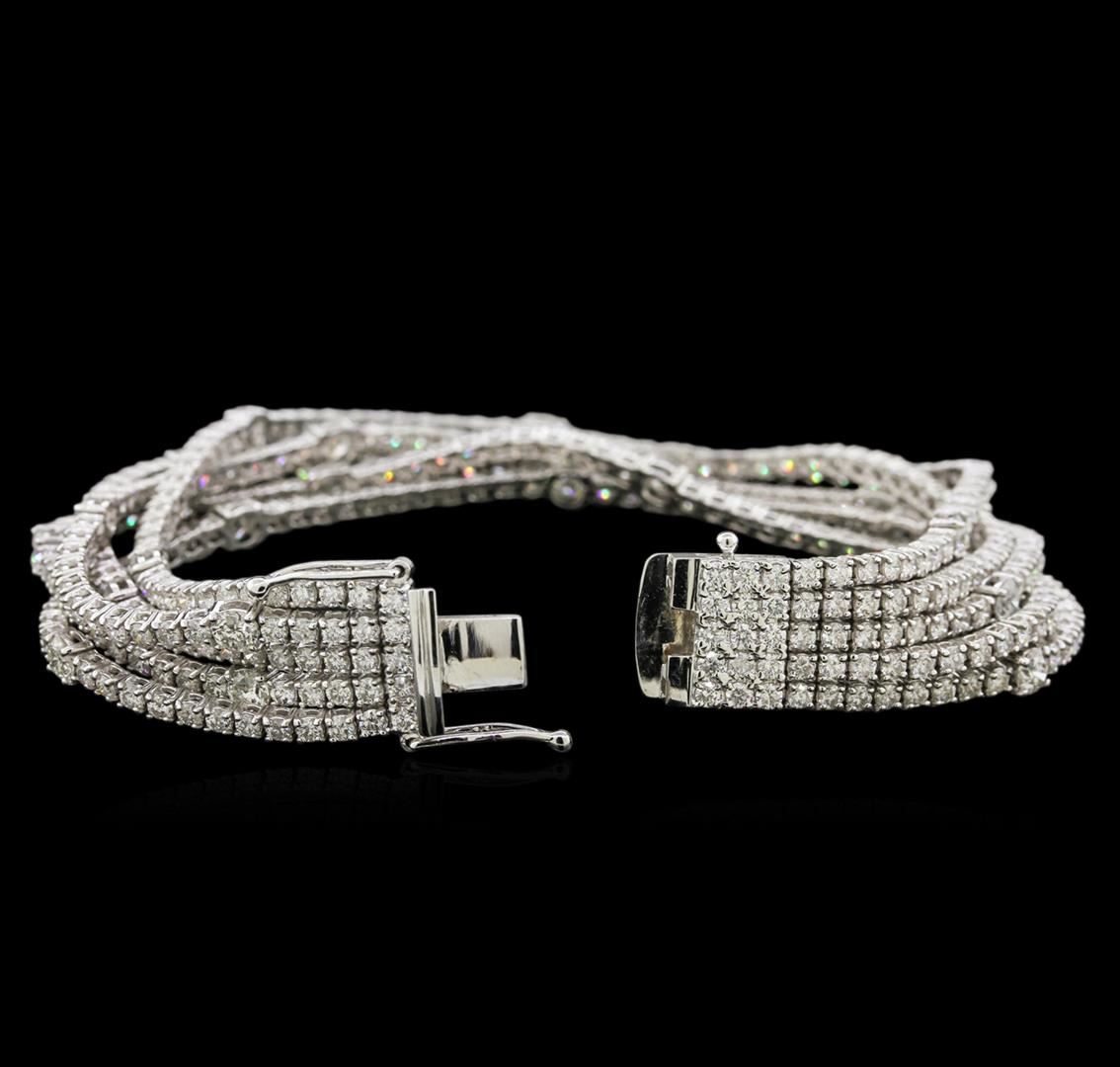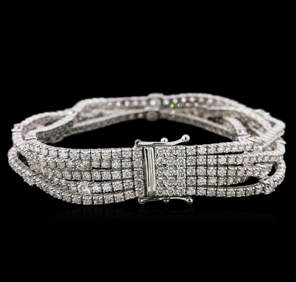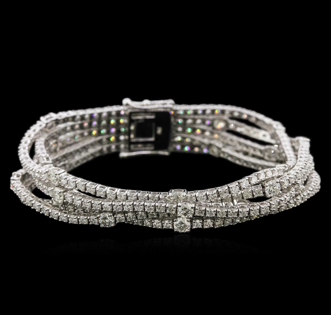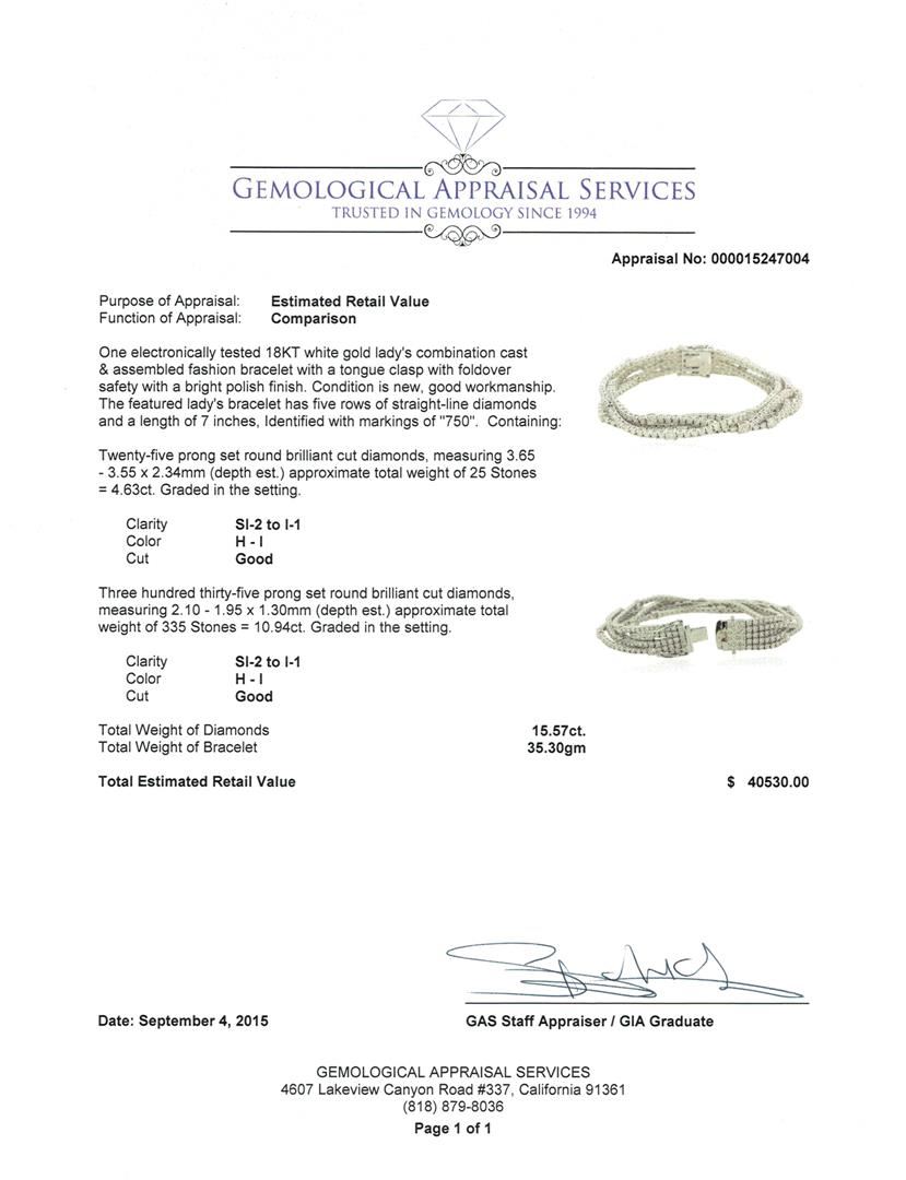One electronically tested 18KT white gold lady's combination cast & assembled fashion bracelet with a tongue clasp with foldover safety with a bright polish finish. The featured lady's bracelet has five rows of straight-line diamonds and a length of 7 inches, Identified with markings of "750". Condition is new, good workmanship. Containing: Twenty-Five prong set round brilliant cut diamonds, measuring 3.65 - 3.55 x 2.34mm (depth est.) approximate total weight of 25 Stones = 4.63ct. Graded in the setting. Clarity: SI-2 to I-1. Color: H - I. Cut Good Three Hundred Thirty-Five prong set round brilliant cut diamonds, measuring 2.10 - 1.95 x 1.30mm (depth est.) approximate total weight of 335 Stones = 10.94ct. Graded in the setting. Clarity: SI-2 to I-1. Color: H - I. Cut Good. Total Weight of Diamonds 15.57ct. Total Weight of Bracelet 35.30gm. GAS Appraised at $40,530.00.