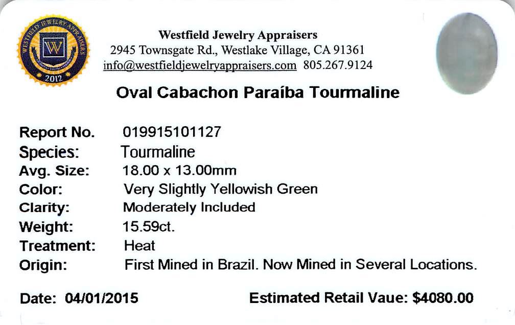 One oval cabochon cut natural Paraiba tourmaline exact weight 15.59ct., clarity is moderately included, cut is good. Westfield Appraised at $4,080.00.