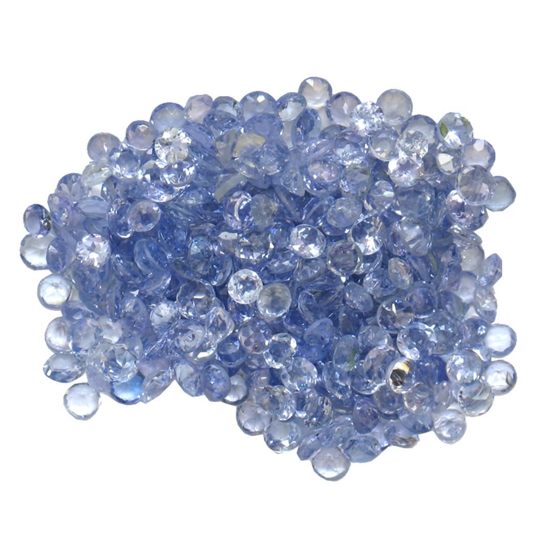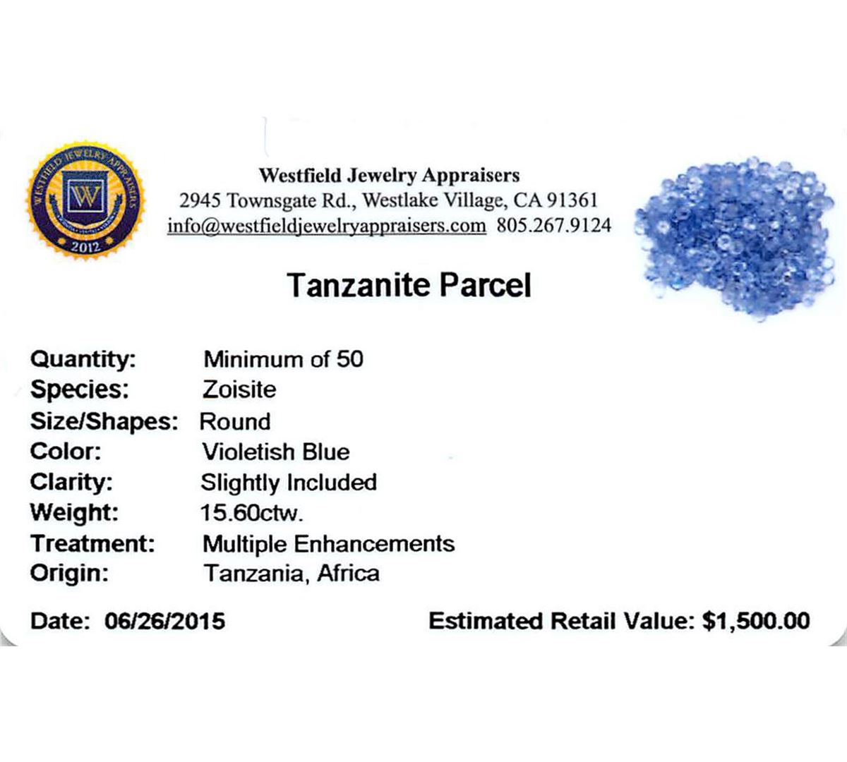 Fifty round mixed cut natural tanzanites, measuring 2.00 - 2.00 x 1.30 mm, exact total weight 15.60ct., clarity is slightly included, type I, medium, very slightly grayish, violetish blue color, (GIA vB 5/3), cut is good. Measurements & the color grade are an average for the group, Color grade is an average for the group, Transmitting light with no distortion, transparent, Naturally occurring internal & external characteristics are present, Indications of multiple laboratory enhancements, including high temperature heat treatment. Westfield Appraised at $1,500.00.