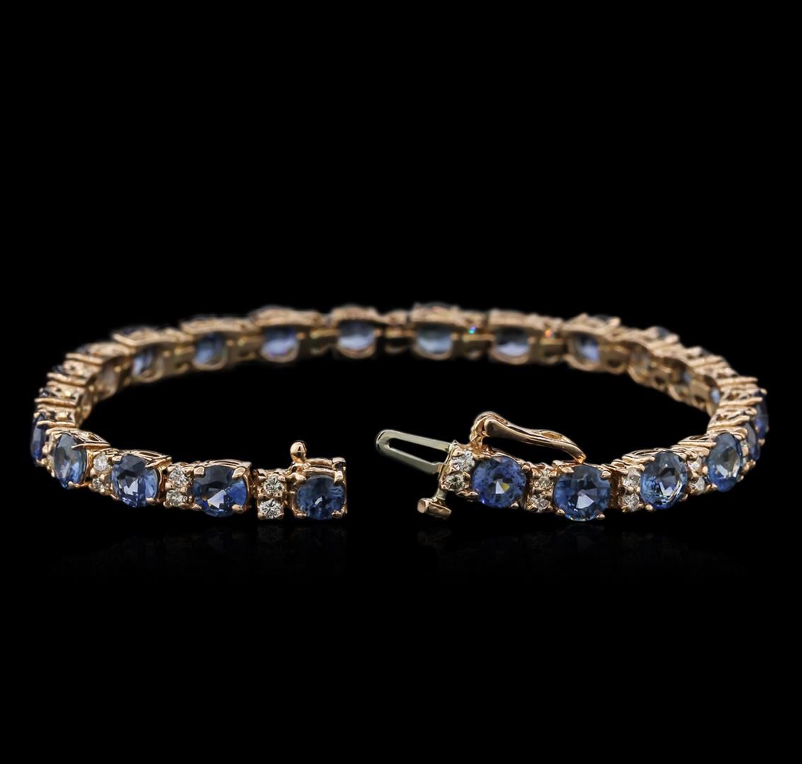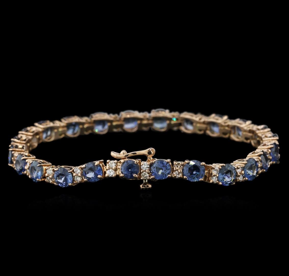 One electronically tested 14KT rose gold ladies cast sapphire and diamond bracelet with a hidden box clasp with safety closer with a bright polish finish. 7.00." in length Identified with markings of "14K". Condition is new. Containing: Twenty-four prong set round modified brilliant cut natural blue sapphires, measuring 5.00 - 5.00 x 3.25 mm, approximate total weight of 15.60ct., clarity is moderately included, type II, light, very slightly grayish, blue color, (GIA B 3/3), cut is good. Forty-Eight prong set round brilliant cut diamonds, measuring 1.60 - 1.60 x 0.96mm (depth est.) approximate total weight of 48 Stones = 0.72ct. Clarity: SI-1. Color: I - J, Cut is Good. Colored gemstones are presumed to have been subjected to commonly used enhancement processes. All diamonds and colored gemstones are graded in the mounting, unless otherwise stated. Total Weight of Colored Stones 15.60ct. Total Weight of Diamonds 0.72ct. Total Weight of Bracelet 16.70 grams. GGL Appraised at $5,965.00.